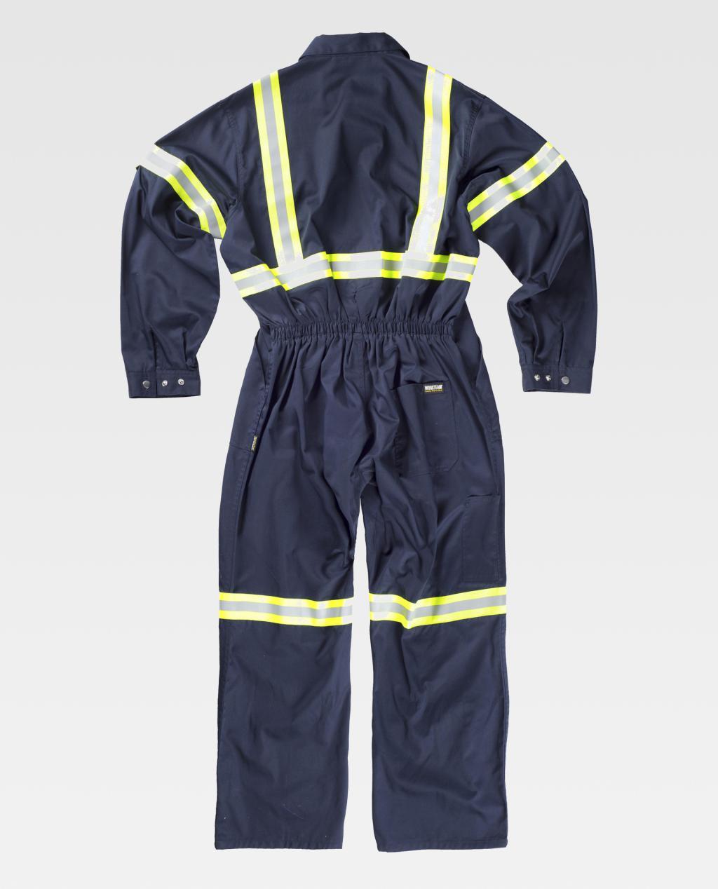 Buzo con cintas reflectante-fluorescentes. Cuello camisero y cierre de cremallera de nylon de doble tirador oculta por solapa postiza con velcro. Un bolso de pecho interior con cremallera de nylon, dos bolsos de plastón de abertura inclinada en los costados. Un bolso trasero de plastón y un bolso de espátula. Una banda fluorescente con una cinta reflectante en pecho, espalda, hombros, mangas y perneras. Puño con corchete metálico. Elástico en la espalda.