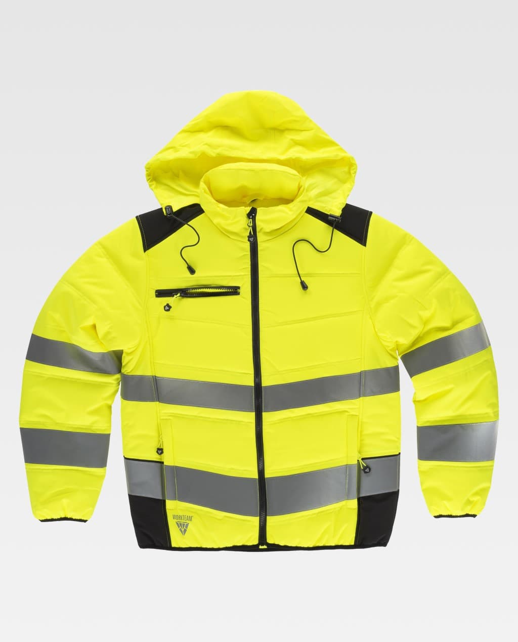 Cazadora acolchada combinada con alta visibilidad y cintas reflectantes. Cuello alto y capucha enrollable con cordón para ajustar. Cierre de cremallera. Solapa protectora interior vuelta en la parte superior cubriendo la cremallera. Dos bolsos laterales interiores con cierre de cremallera. Un bolso de pecho interior con cierre de cremallera. Dos cintas reflectantes de distinto tamaño en pecho, espalda y mangas. Puños y bajo ribeteados con bies elástico a contraste.