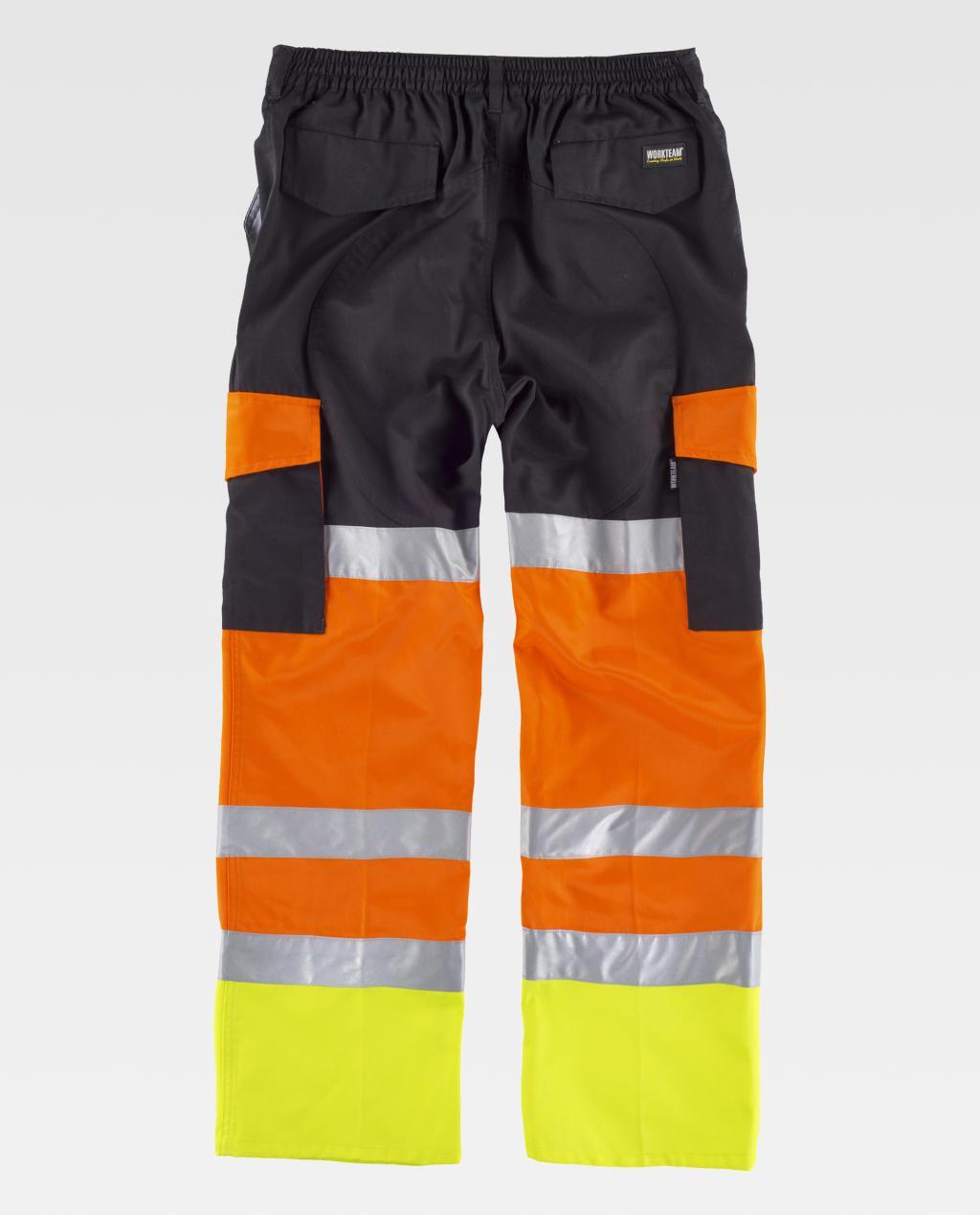 Pantalón con refuerzos combinado con alta visibilidad y cintas reflectantes. Dos bolsos de abertura inclinada en los costados, dos bolsos laterales de carga con cartera de pico y velcro. Dos bolsos traseros interiores con cartera de velcro. Refuerzo en culera. Tricolor y con tres cintas reflectantes en perneras. Elástico en la cintura. Trabillas. Cierre de botón y bragueta de cremallera.
