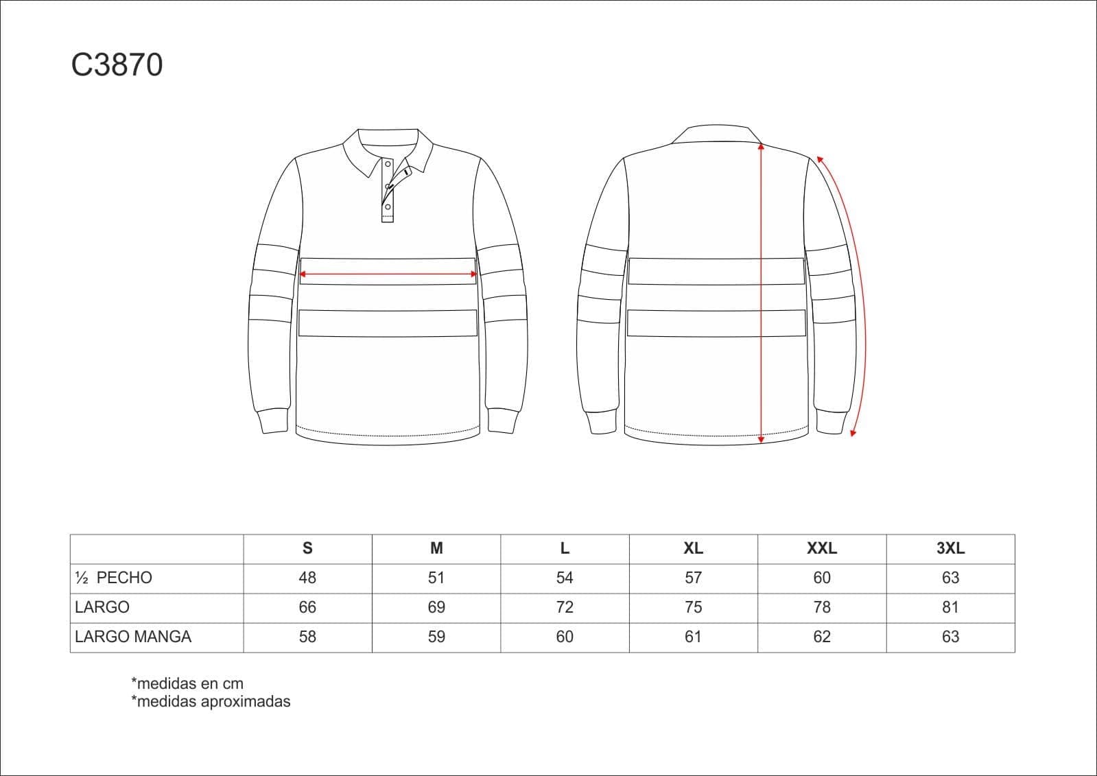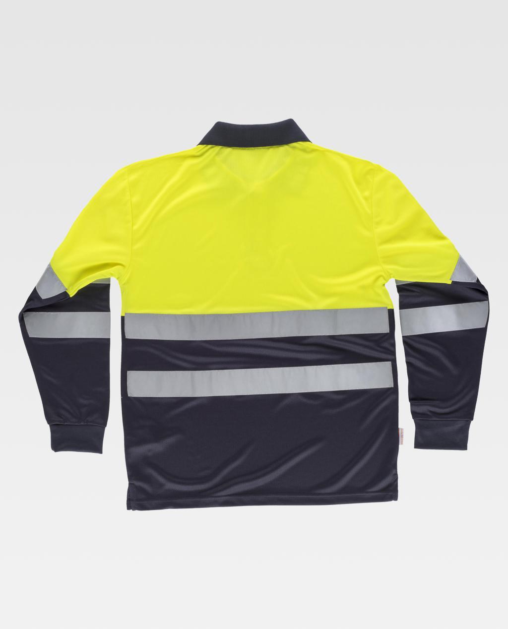 Polo combinado de manga larga en poliéster ojo de perdiz con cintas reflectantes. Parte superior de alta visibilidad. Cuello clásico con tapeta de tres botones y cubrecosturas interior. Aberturas laterales. Dos cintas reflectantes en pecho, espalda y mangas. Puño elástico. Cuello y puños en punto canalé. Tejido fresco y ligero de alta permeabilidad al aire. Transpirable, de fácil secado y resistente al encogimiento.