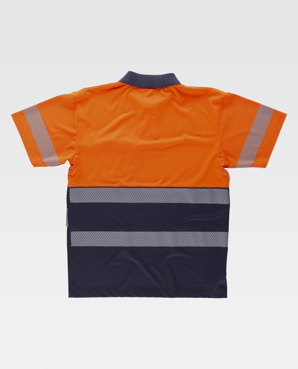 Polo combinado de manga corta en micropiqué de poliéster. Parte superior de alta visibilidad. Reflectantes y rejilla para regular la transpiración en axilas. Cuello clásico con tapeta de tres botones y cubrecosturas interior. Un bolso de pecho de ojal. Una reflectante segmentada termoadhesiva en mangas y dos en pecho y espalda. Cuello en punto canalé.