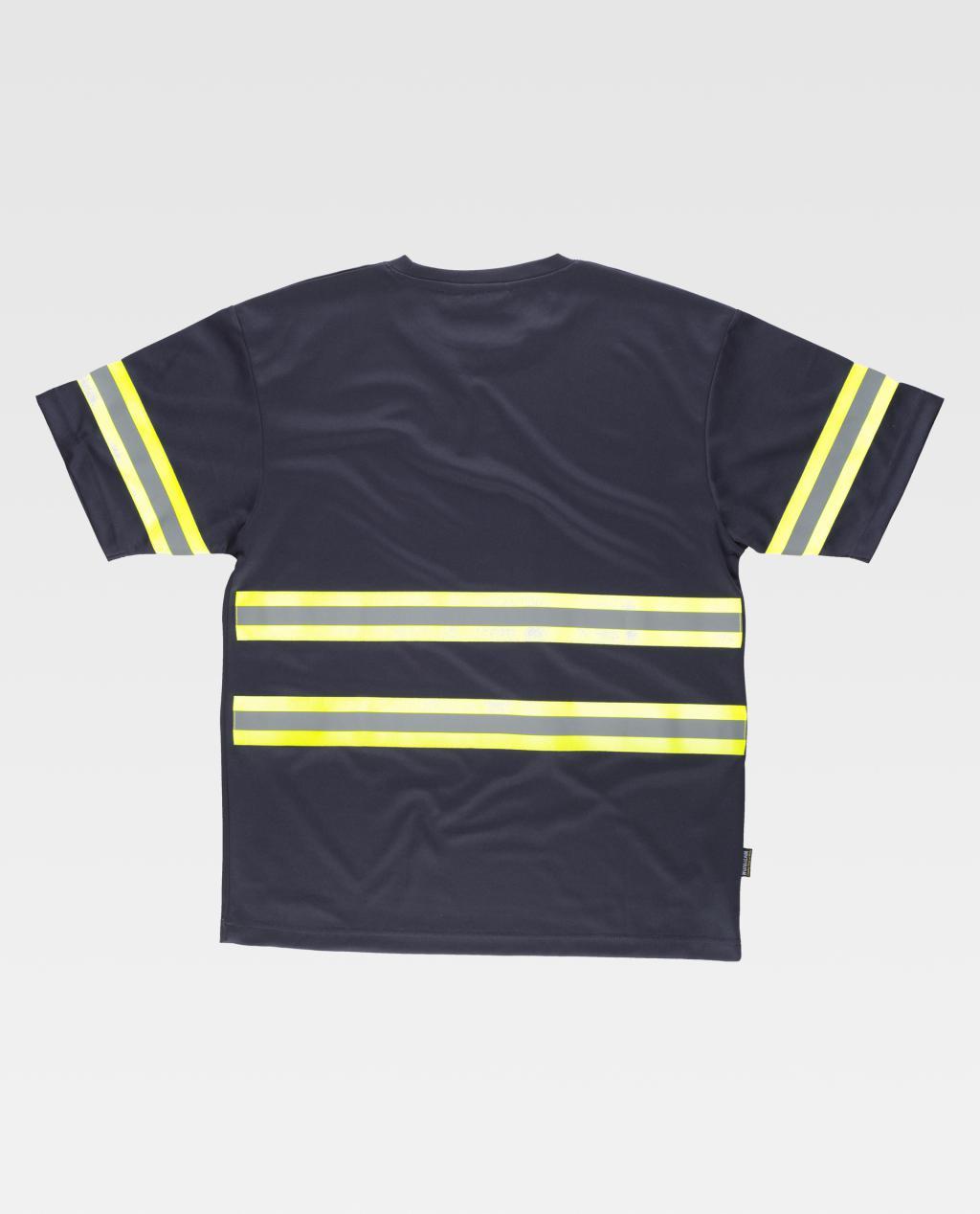 Camiseta clásica de manga corta en tejido piqué con cintas reflectante-fluorescentes. Cuello redondo con cubrecosturas interior. Una banda fluorescente con una cinta reflectante en mangas y dos en pecho y espalda.
