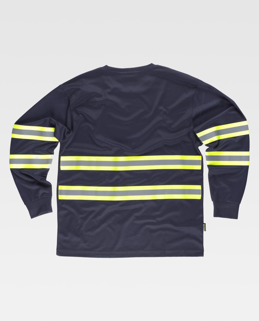 Camiseta clásica de manga larga en tejido piqué y cintas reflectante-fluorescentes. Cuello redondo en con cubrecosturas interior. Dos bandas fluorescentes con una cinta reflectante en pecho, espalda y mangas. Puño elástico.