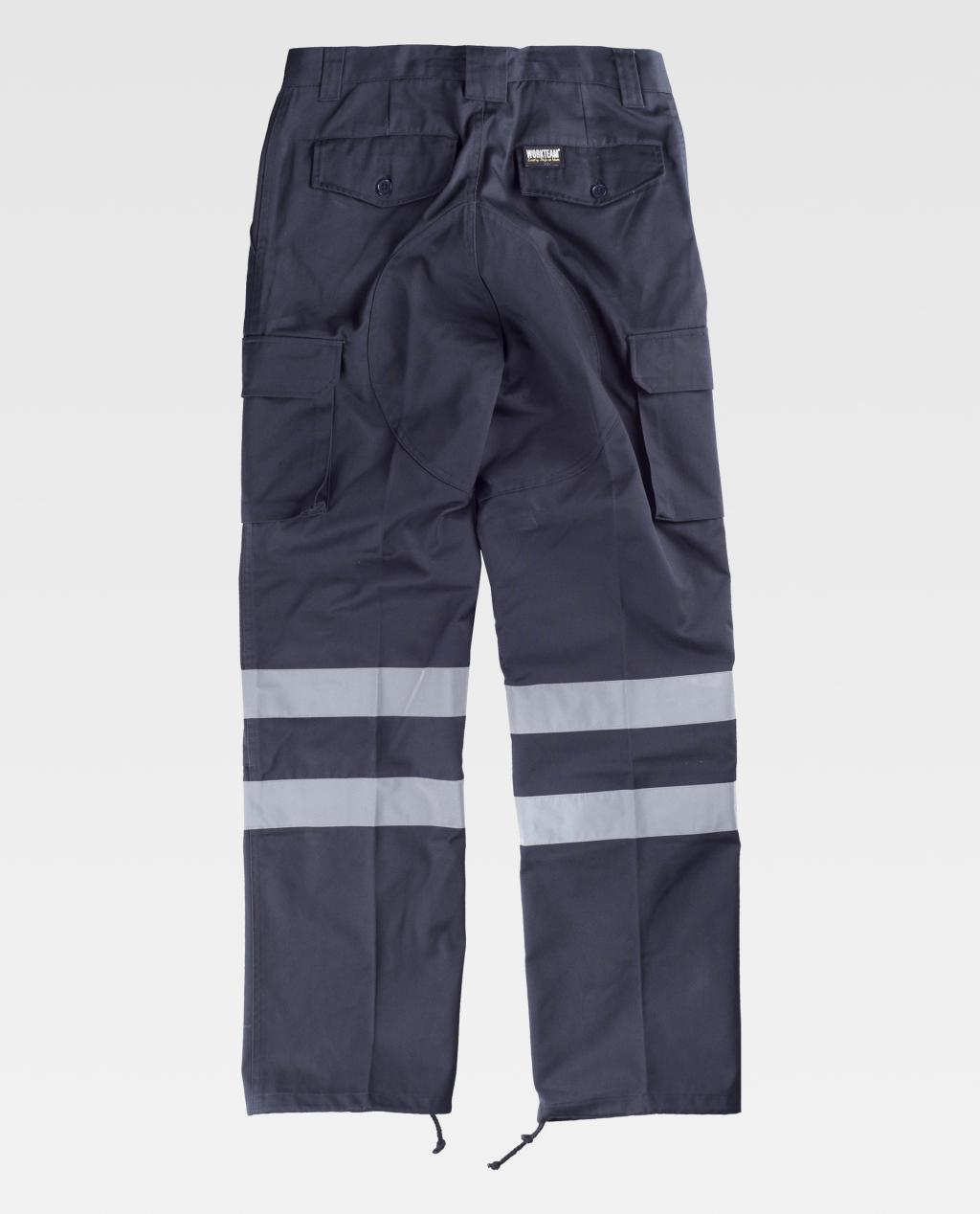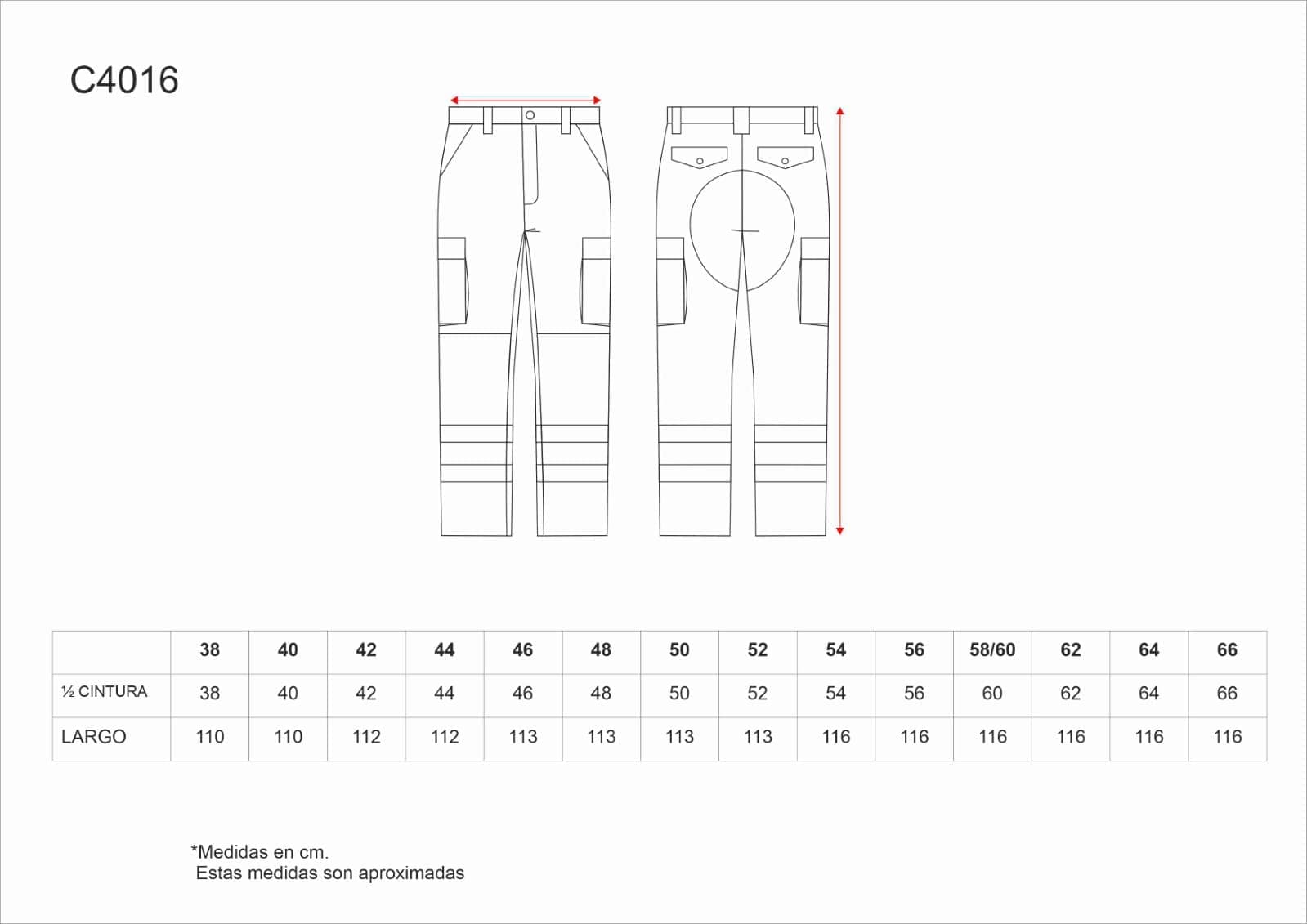 Pantalón con refuerzos y cintas reflectantes. Dos bolsos de abertura inclinada en los costados. Dos bolsos laterales de carga con cartera de botón oculto. Dos bolsos traseros interiores con carteras de pico y botón. Rodilleras y culera reforzadas. Dos cintas reflectantes en perneras. Sin elástico en cintura. Bajos ajustables con cordón. Trabillas anchas. Cierre de botón y bragueta de cremallera.