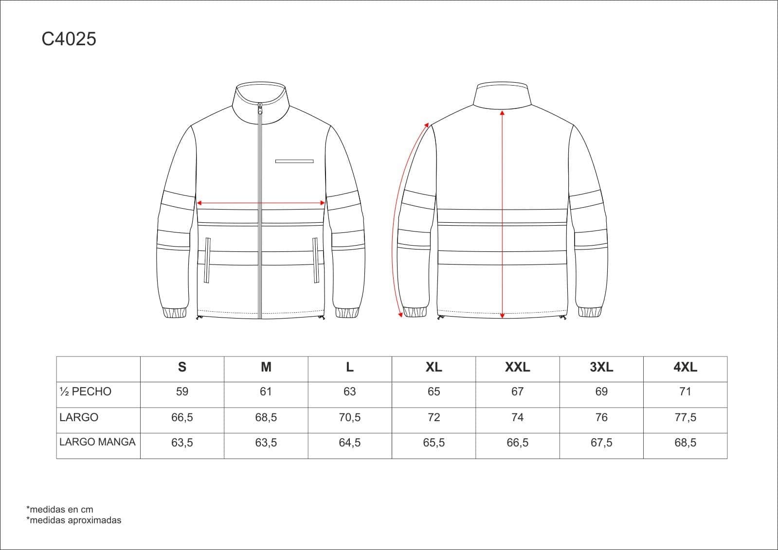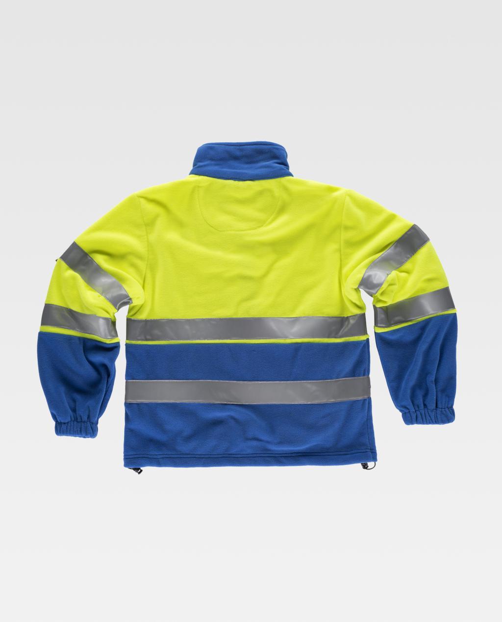 Chaqueta polar combinada con cintas reflectantes. Parte superior de alta visibilidad. Cuello alto y cierre de cremallera de nylon. Un bolso de pecho y dos bolsos laterales interiores con cremallera de nylon. Dos cintas reflectantes en pecho, espalda y mangas. Puño con elástico. Cordón elástico con pieza ajustable en bajo.