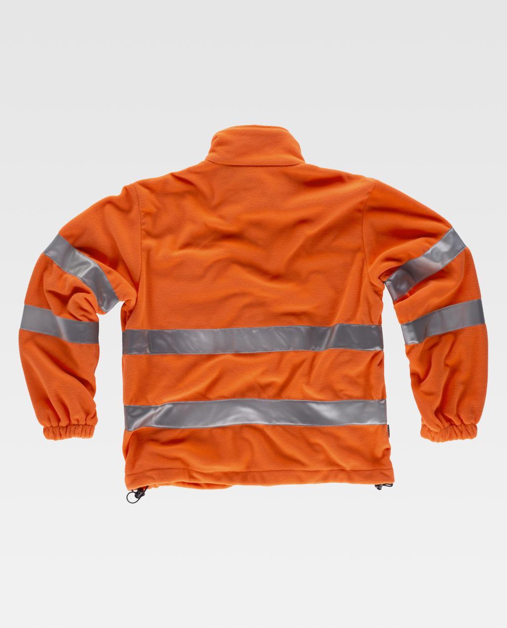 Chaqueta polar de alta visibilidad con cintas reflectantes. Cuello alto y cierre de cremallera de nylon. Un bolso de pecho y dos bolsos laterales interiores con cremalleras de nylon. Dos cintas reflectantes en pecho, espalda y mangas. Puño con elástico. Cordón elástico con pieza ajustable en bajo.