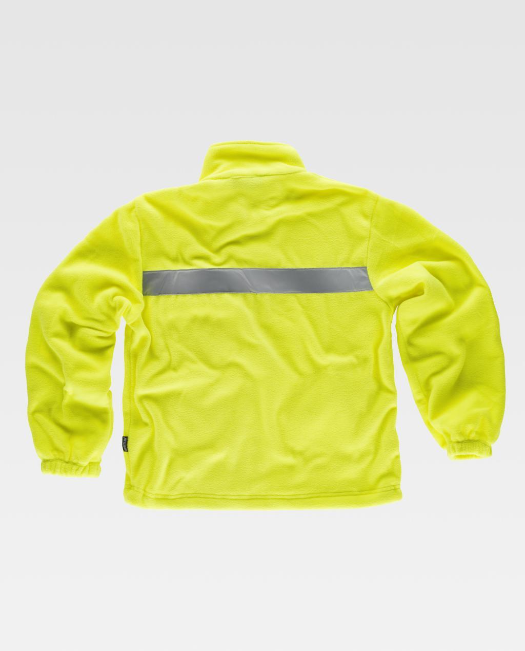 Chaqueta polar de alta visibilidad con cintas reflectantes. Cuello alto y cierre de cremallera de nylon. Un bolso de pecho y dos bolsos laterales interiores con cremalleras de nylon. Una cinta reflectante en pecho y espalda. Puño con elástico. Cordón elástico con pieza ajustable en bajo.