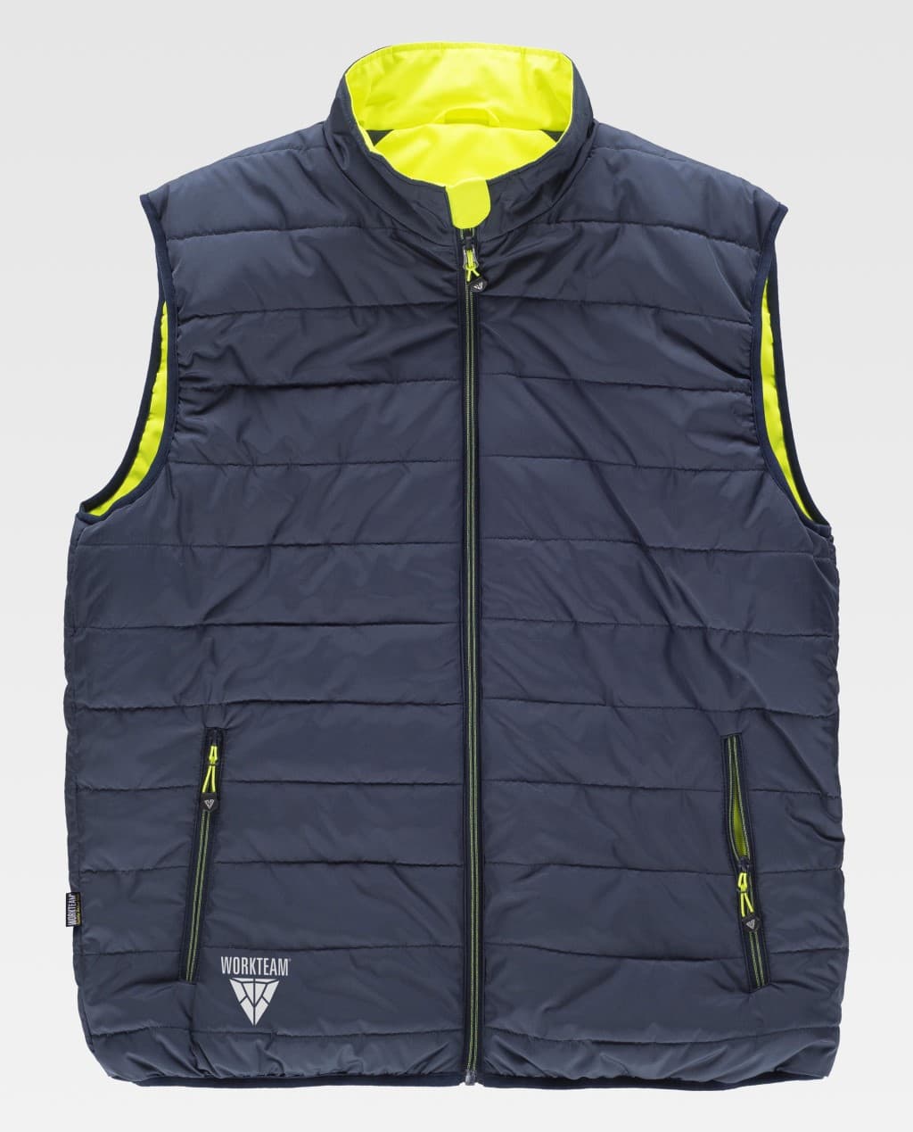 Chaleco reversible acolchado. Cuello alto con cierre de cremallera de nylon. Solapa protectora cubriendo la cremallera. Ribeteado con bies elástico a contraste. Exterior: Combinado con alta visibilidad y cintas reflectantes segmentadas. Dos bolsos laterales interiores con cierre de cremallera. Un bolso de pecho interior con cierre de cremallera. Dos cintas reflectantes segmentadas termoadhesivas en pecho y espalda. Colgador en la parte trasera del cuello. Interior: Acolchado pespunteado. Dos bolsos laterales interiores con cierre de cremallera.
