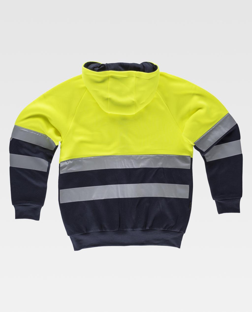 Sudadera combinada con cintas reflectantes. Capucha con cordón elástico y pieza ajustable. Cierre de cremallera. Cubre costuras en el interior del cuello y costuras reforzadas. Parte superior de alta visibilidad. Dos bolsos laterales interiores. Dos cintas reflectantes en pecho, espalda y mangas. Suave y cálido acabado en el interior. Puños y cintura elásticos en punto canalé.