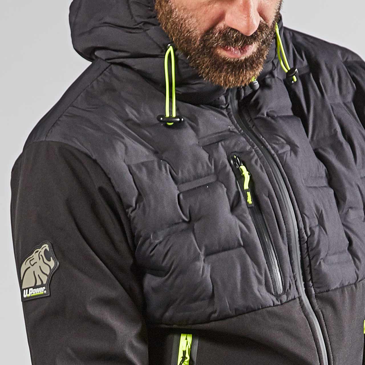 Chaqueta híbrida repelente al agua, transpirable y antiviento, extremadamente versátil e ideal para quienes realizan trabajos dinámicos en ambientes fríos o medio-templados, sin por ello sacrificar la libertad de movimiento. Cierre central con cremallera impermeable. Capucha fija y ajustable, puños elásticos. Chaqueta de plumón acolchado con tecnología sin costuras. Forro interior de nailon y microfibra con impresión serigráfica. Dos amplios bolsillos delanteros con cierre de cremallera fluorescente y un bolsillo en el pecho con cierre de cremallera impermeable. Dos amplios bolsillos interiores. Dobladillo contorneado y ribete fluorescente en la espalda. Logotipo U-Power tono sobre tono.