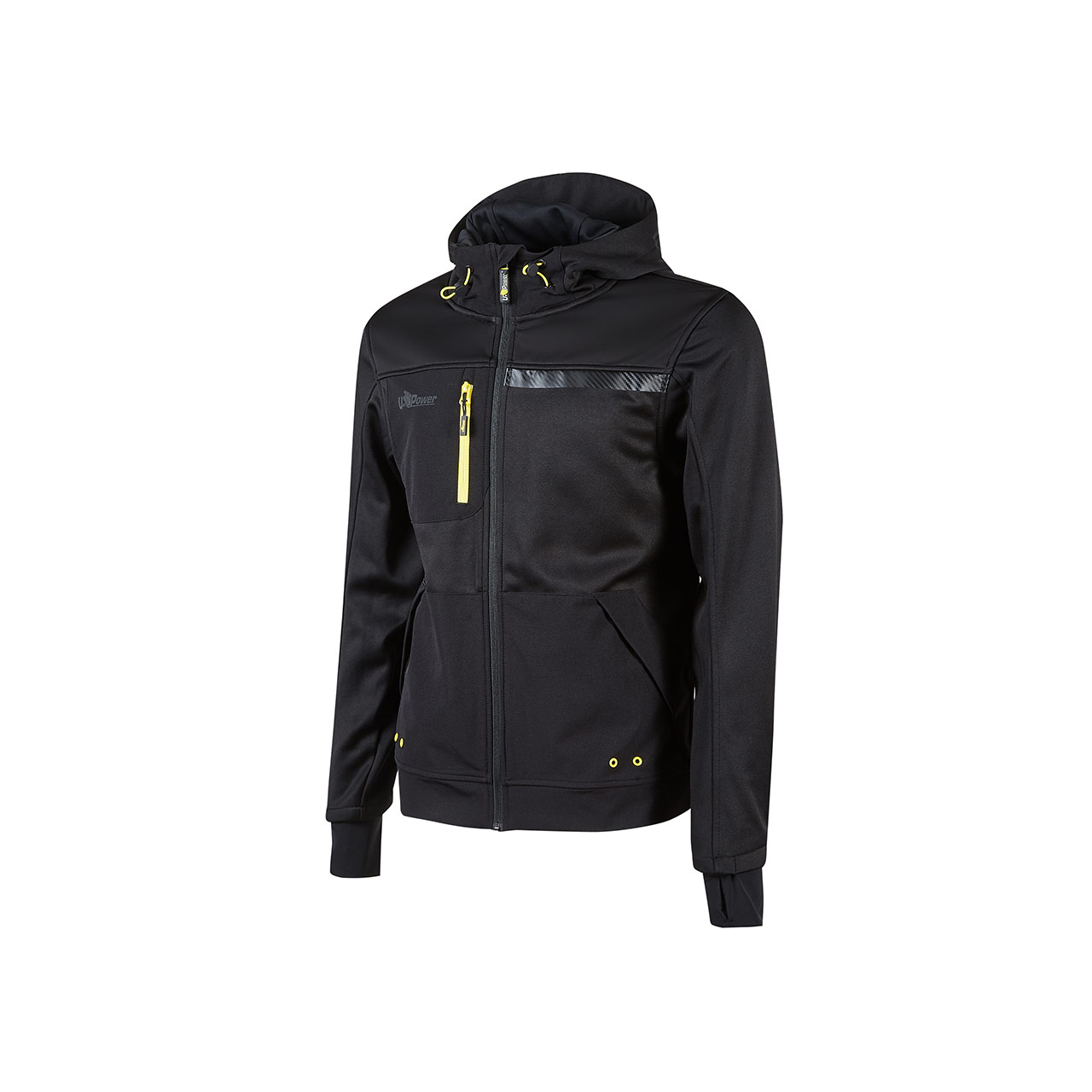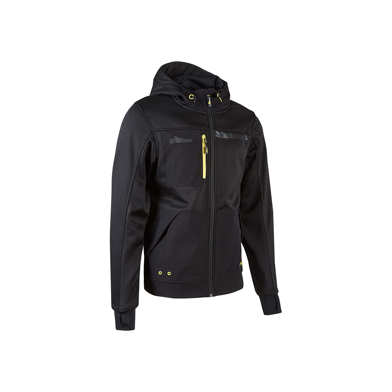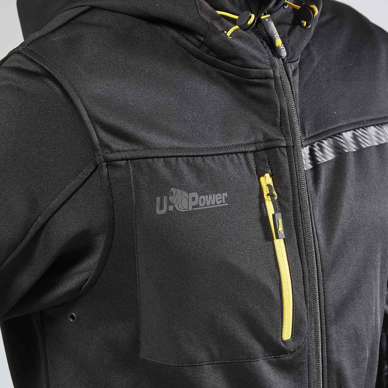 La banda reflectante en el pecho izquierdo y en la capucha garantiza visibilidad en las variantes de color Asphalt Grey y Dark Green, mientras en la variante Black Carbon las bandas tienen un efecto carbono. Impresión del logotipo reflectante “U-Power” del lado derecho del pecho.