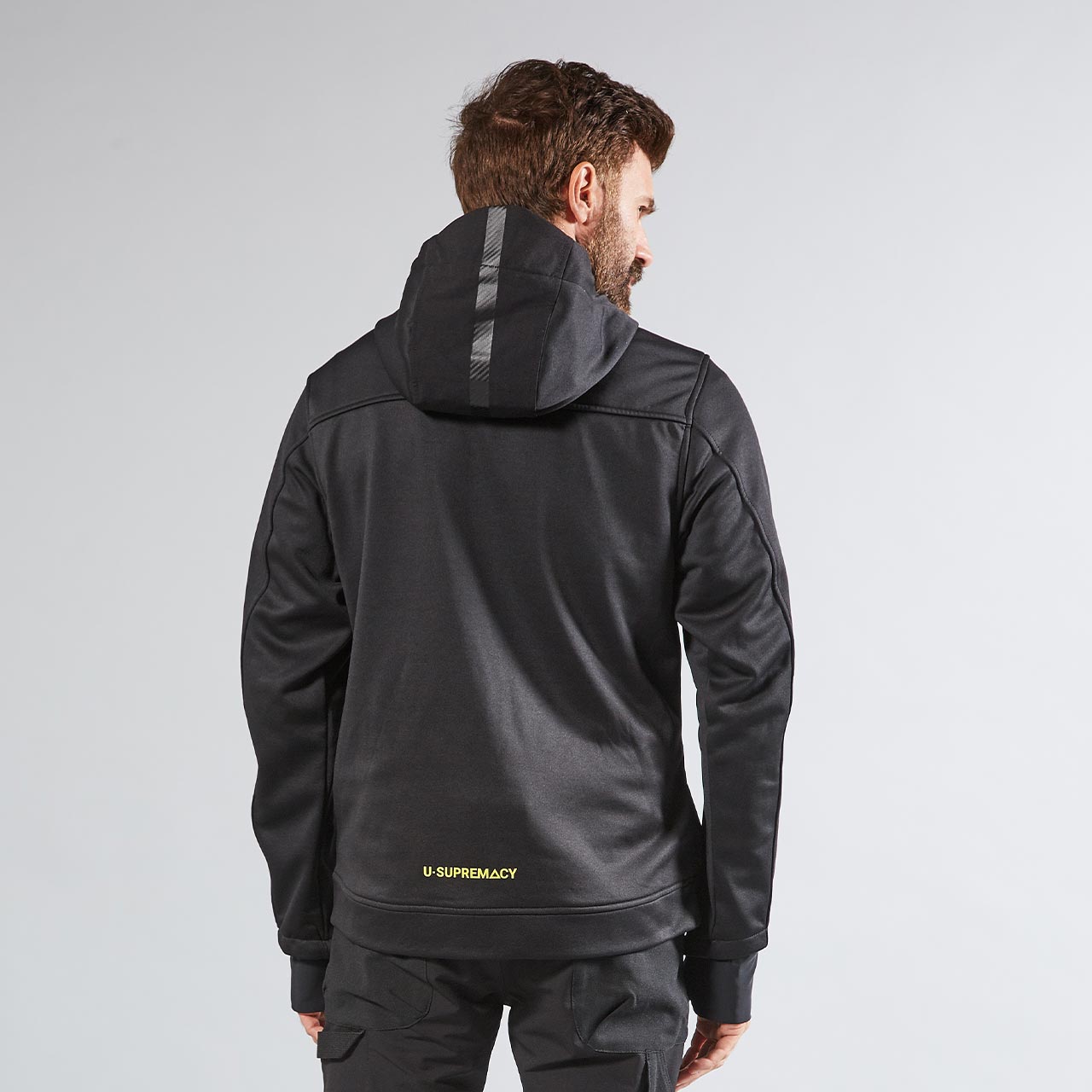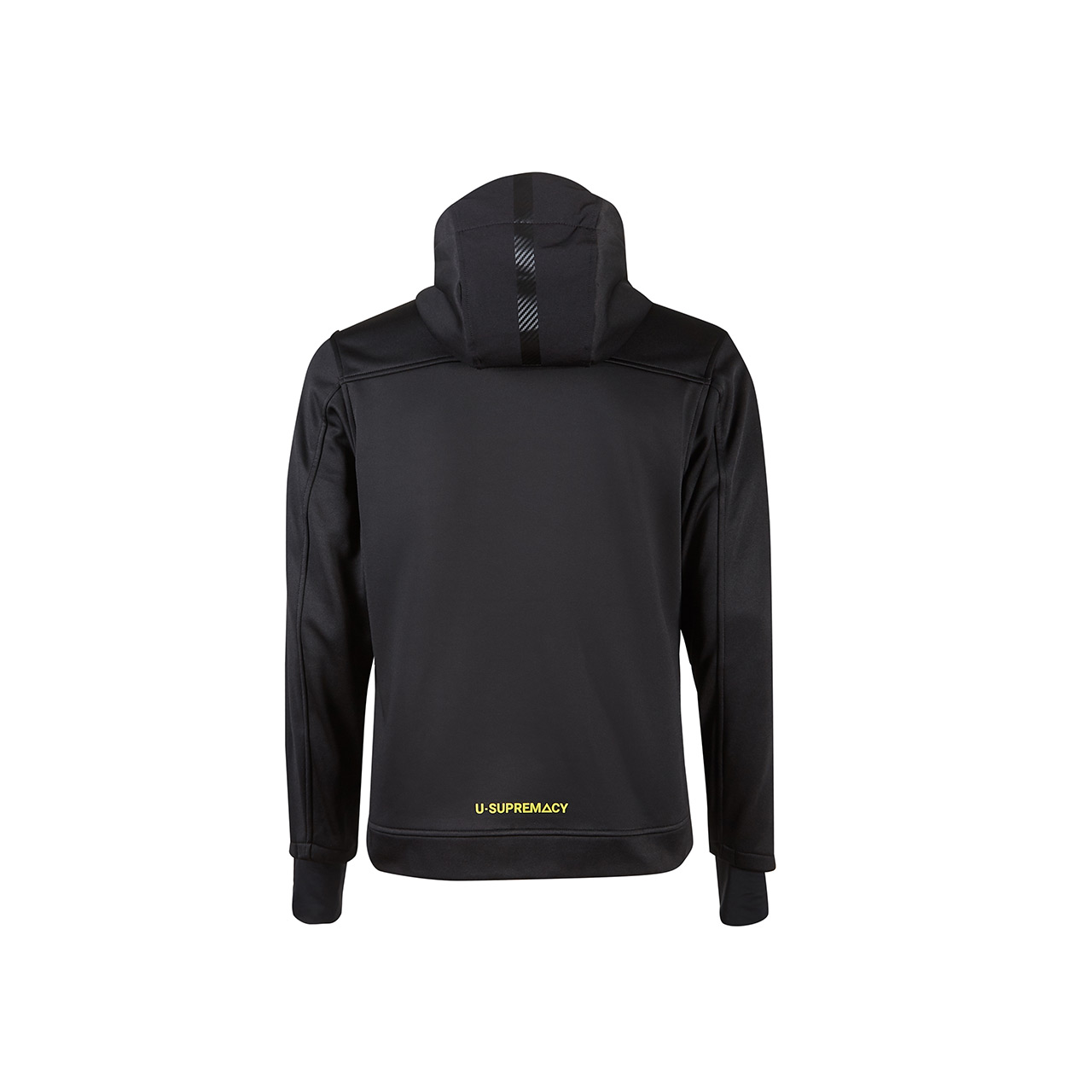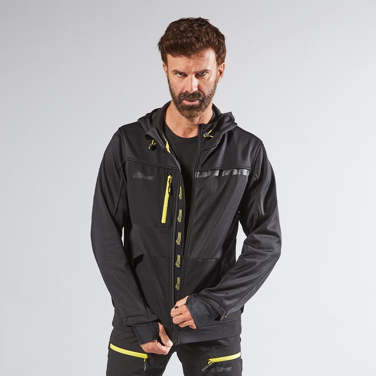 La banda reflectante en el pecho izquierdo y en la capucha garantiza visibilidad en las variantes de color Asphalt Grey y Dark Green, mientras en la variante Black Carbon las bandas tienen un efecto carbono. Impresión del logotipo reflectante “U-Power” del lado derecho del pecho.