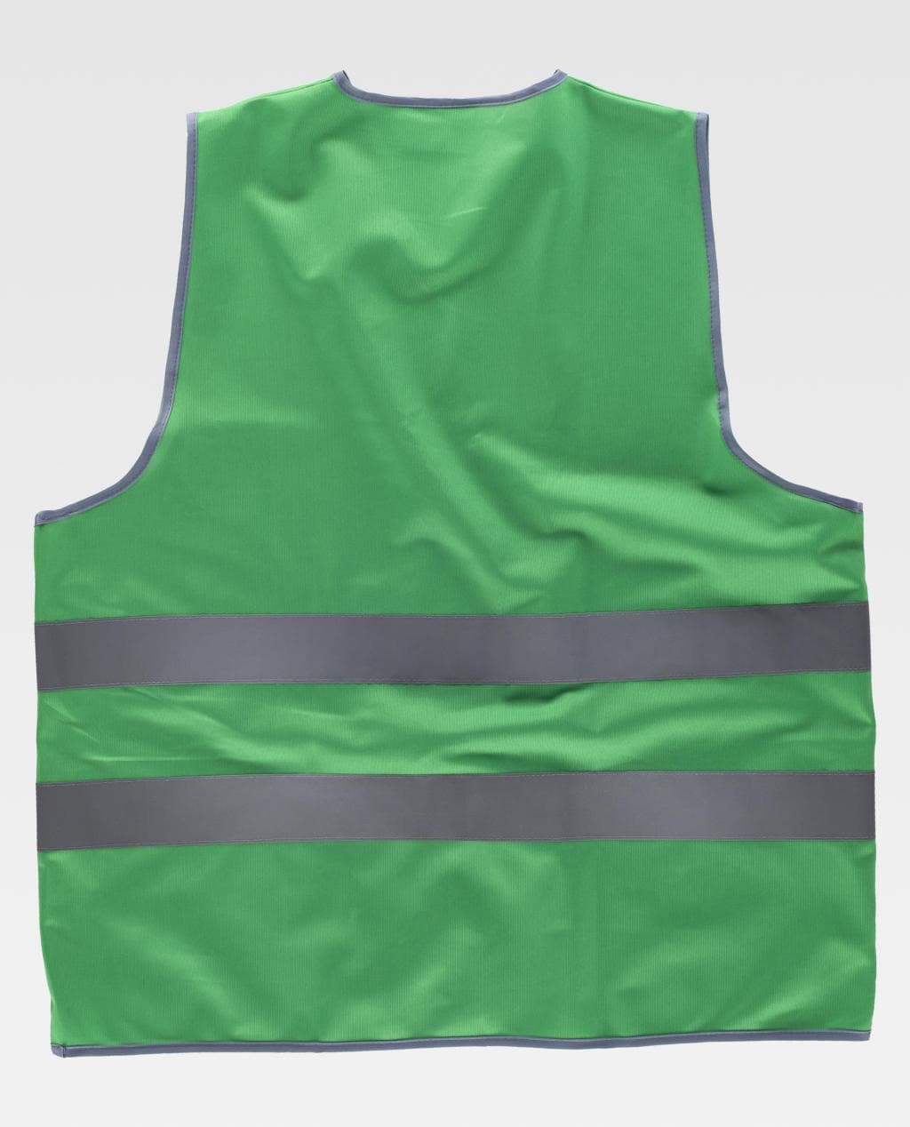Chaleco con cintas reflectantes. Escote a pico y cierre de velcro adaptable. Dos cintas reflectantes en pecho y espalda. Ribeteado con bies a contraste.
