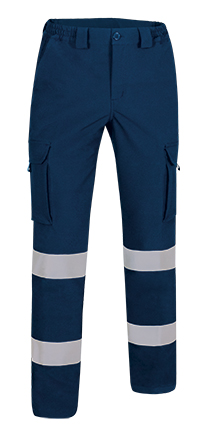 Pantalón de trabajo multibolsillos confeccionado en tejido bielástico con acabado hidrofugado, repelente al agua. Cintura con goma elástica en los laterales para mayor comodidad y mejor adaptación al cuerpo. Dos bandas retrorreflectantes termofijadas en el contorno de la pierna, bajo las rodillas, que aumentan la visibilidad de los usuarios. Dos bolsillos laterales tipo cargo con cierre de velcro y tapa y detalle de cinta textil bicolor retrorreflectante en el centro de la tapa. Dos bolsillos laterales en cadera y dos bolsillos traseros con cierre de cremallera