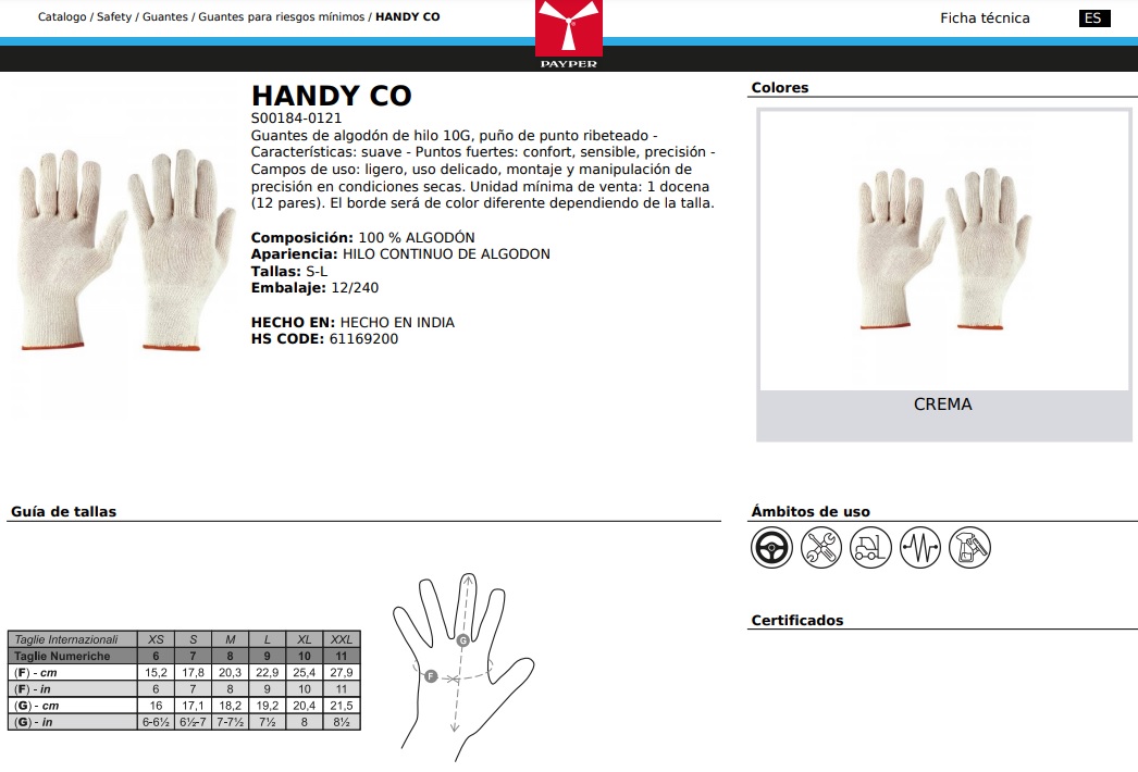 GUANTES HANDY CO · 100% ALGODON · GALGA 10 | Pack 12 pares