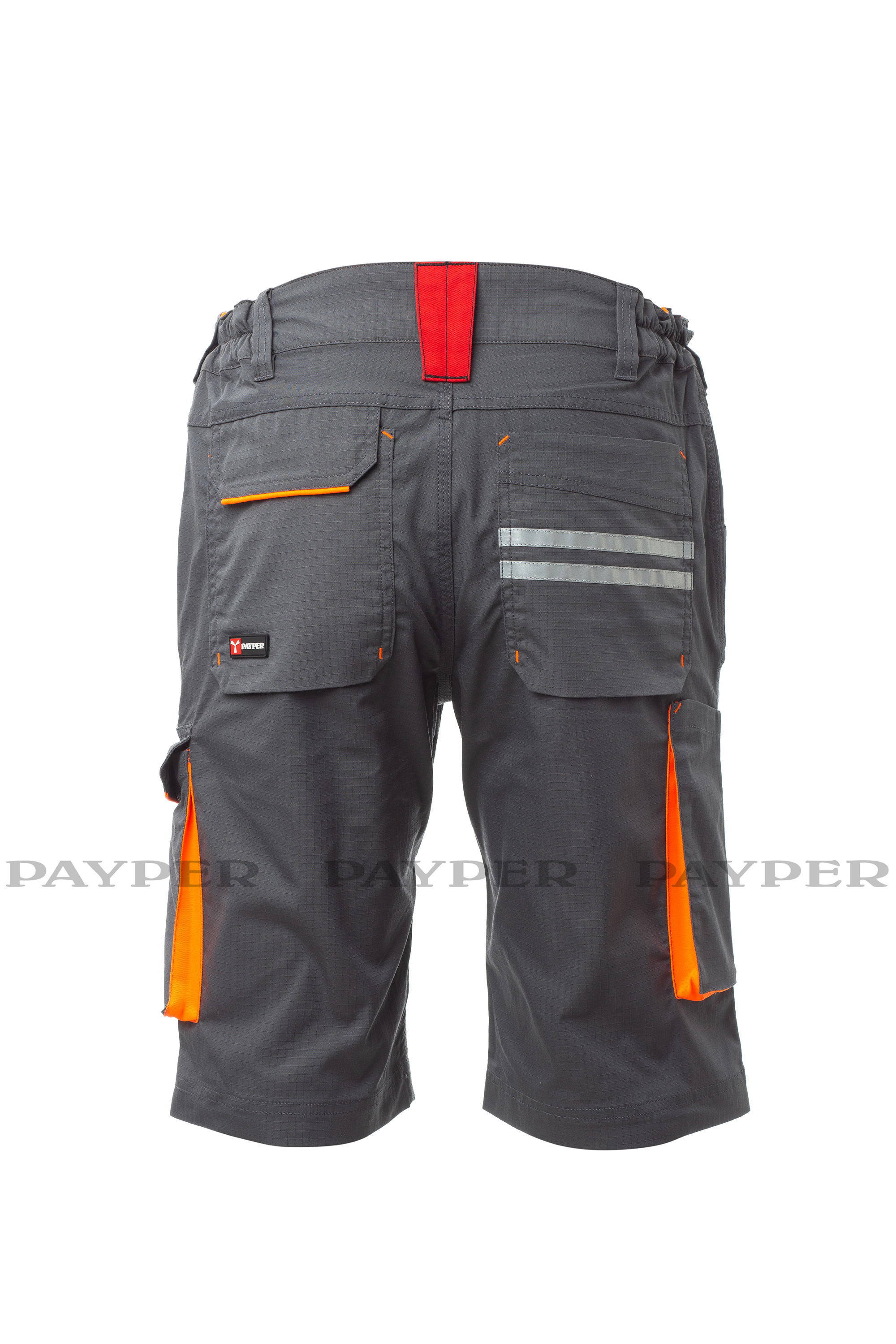 Bermudas unisex de tejido elástico, con elásticos laterales y trabillas en la cintura, cierre con cremallera y botón personalizado. En el delantero tiene dos bolsillos perfilados, un bolsillo pequeño para monedas a la derecha y un bolsillo pequeño de seguridad cerrado con cremallera a la izquierda. En la parte delantera de la pernera izquierda presenta un bolsillo con fuelle, tapeta cerrada con velcro y soporte para tarjeta de identificación. En la parte delantera de la pernera derecha presenta un bolsillo para el teléfono móvil con borde retrorreflectante y un bolsillo con fuelle. En la parte trasera presenta un bolsillo con tapeta cerrado con velcro, un bolsillo sin tapeta pero con 2 bandas retrorreflectantes, un bolsillo para el metro (pernera derecha). También presenta: costuras de triple aguja en la entrepierna y en el interior y exterior de la pernera, y costuras de refuerzo en contraste en distintos puntos. En las tallas (italianas) centrales 48-50-52, el interior de la pernera tiene una longitud de 31 cm.