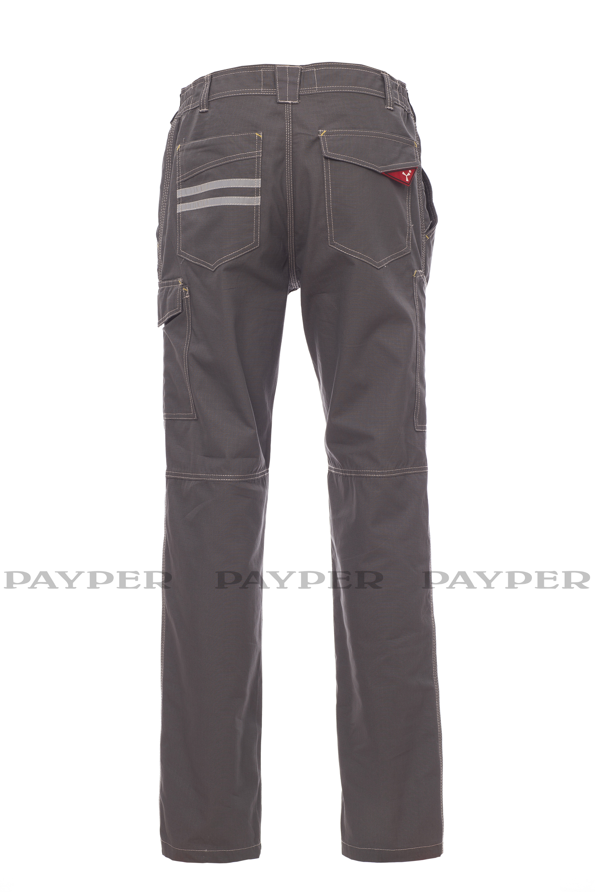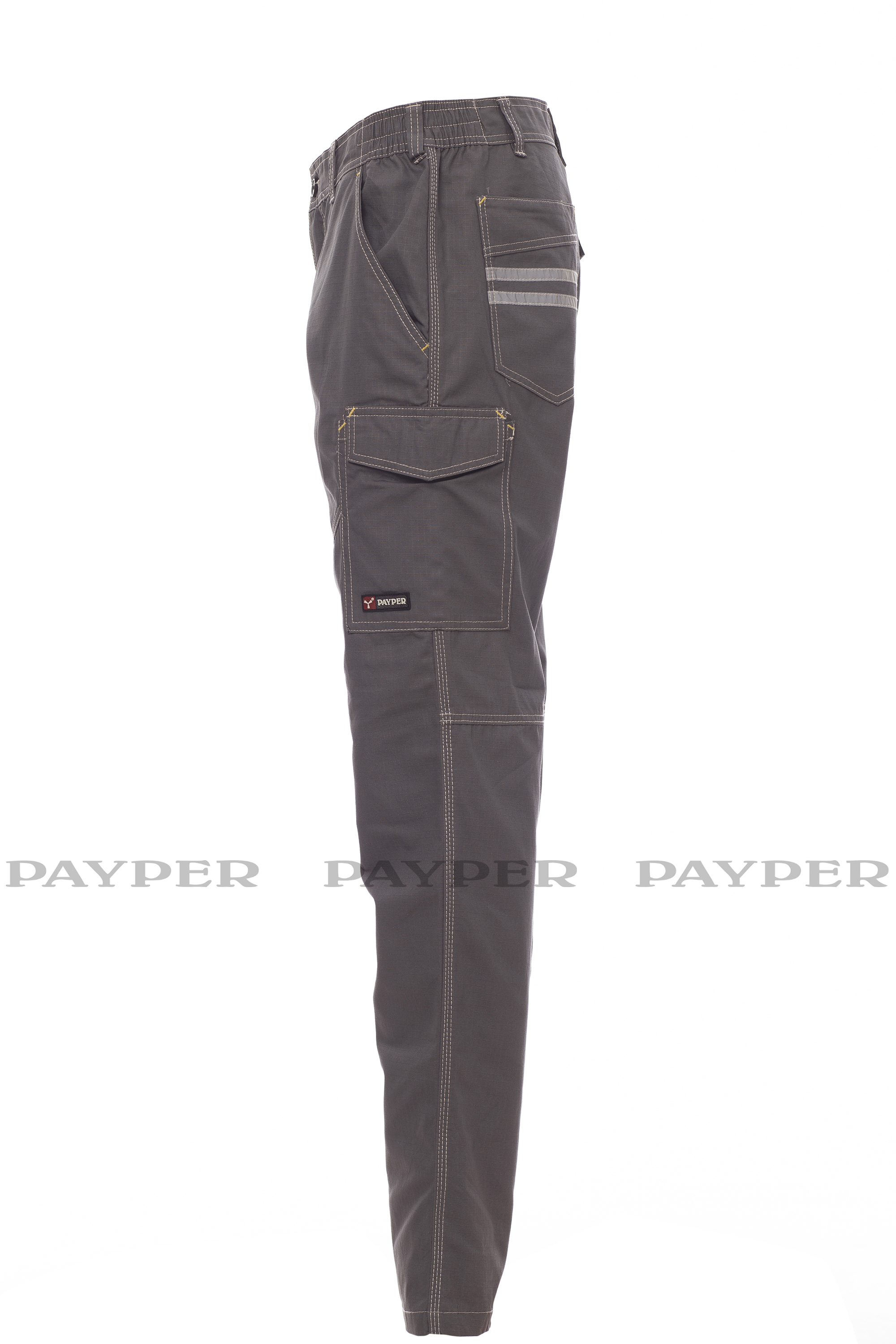 Pantalón unisex, confeccionado en tejido ripstop elástico, ligero, con bandas reflectantes, elásticos laterales y trabillas en la cintura. Cierre con cremallera y botón de plástico, dos bolsillos delanteros de corte clásico, un bolsillo lateral con LOCK SYSTEM, un soporte para metro; dos bolsillos traseros, uno con tapeta y velcro y otro abierto, aplicaciones y pespuntes de contraste, bandas reflectantes en el bolsillo trasero, costura de triple aguja.