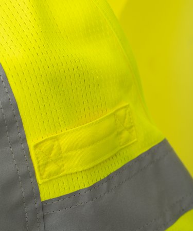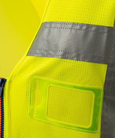 Chaleco de alta visibilidad confeccionado en malla transpirable en la parte superior y en tejido Dry-Tech en la parte inferior, con bandas retrorreflectantes horizontales en hombros, pecho y cintura y dos bandas retrorreflectantes verticales. Cierre con cremallera SBS, con cinta bicolor. Soporte fijo para tarjeta de identificación a la altura del pecho izquierdo con la prenda puesta. Trabilla multifunción, un bolsillo para bolígrafos cerrado con velcro y anilla en el pecho derecho con la prenda puesta. Dos bolsillos exteriores con fuelle cerrados con velcro en la parte superior y apertura lateral.