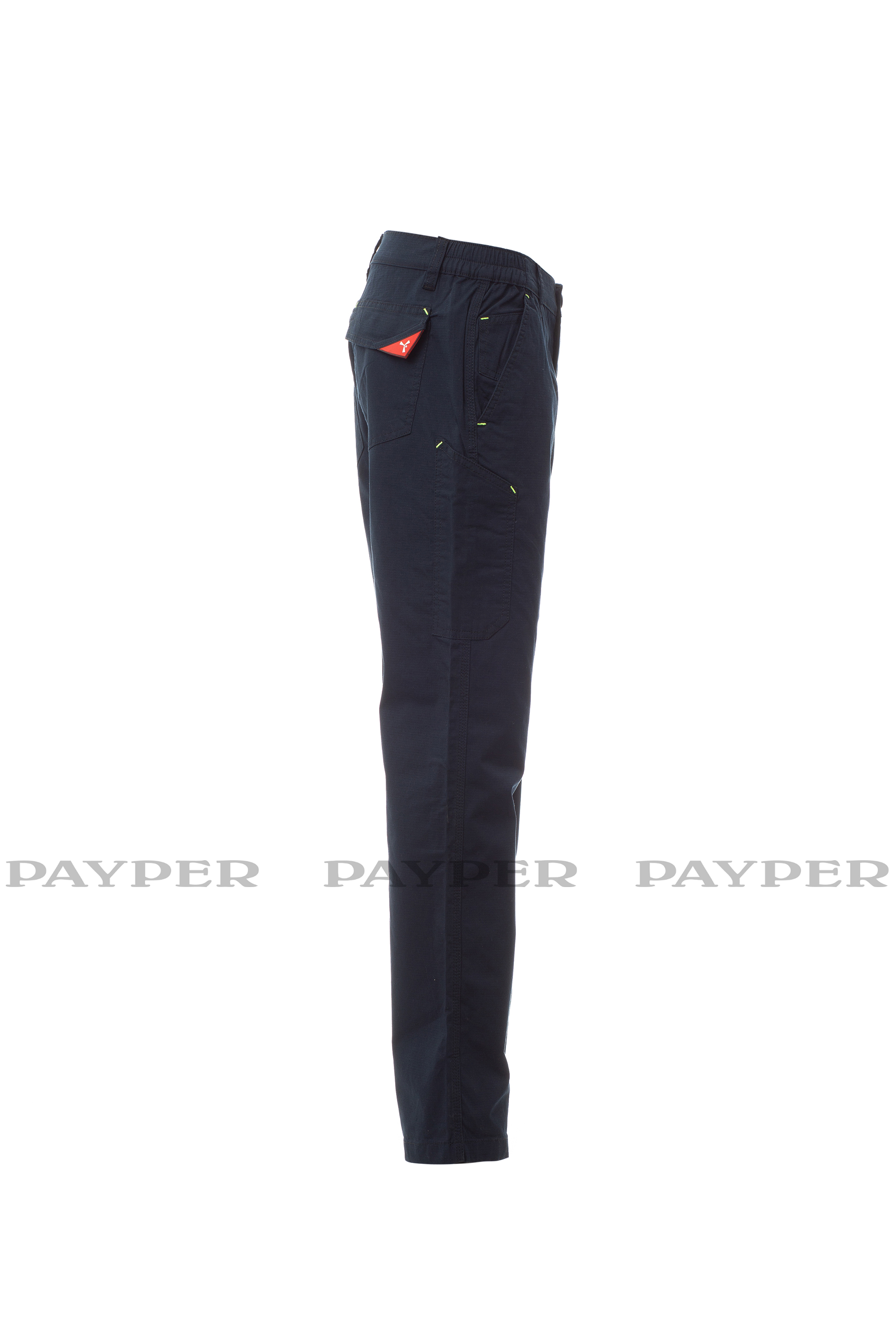 Pantalón de tejido ripstop elástico, ligero, con trabillas y elástico en la cintura, cierre con cremallera y botón en la cintura. Costuras reforzadas en la entrepierna y en el interior de la pierna con triple aguja, y costuras en los laterales con doble aguja. Bolsillos delanteros de corte clásico, con bolsillo pequeño portamonedas en el bolsillo derecho (con la prenda puesta) y soporte para metro lateral. Bolsillo lateral izquierdo con tapeta de cierre LOCK SYSTEM. Dos bolsillos posteriores, de los cuales uno con tapeta y velcro.
