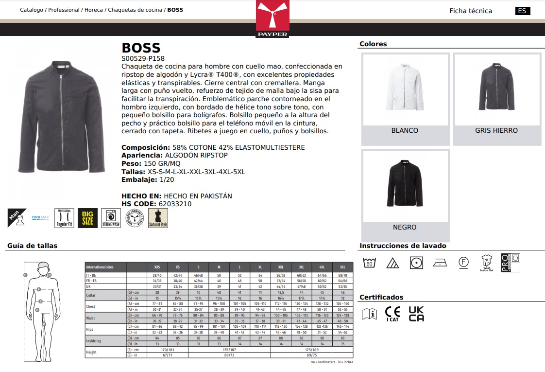 CHAQUETA COCINA BOSS · ELASTICO/STRETCH · CIERRE CREMALLERA · ALGODON RIPSTOP · COOLMAX · CE I CAT - Chaquetas Cocina - PayPer - Hombre