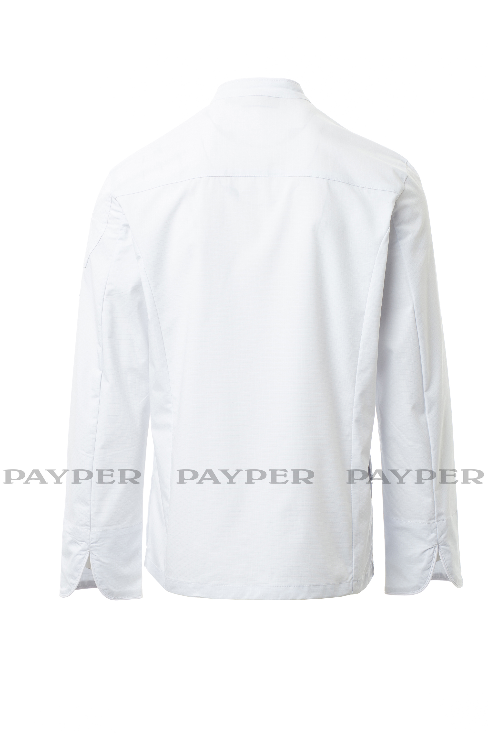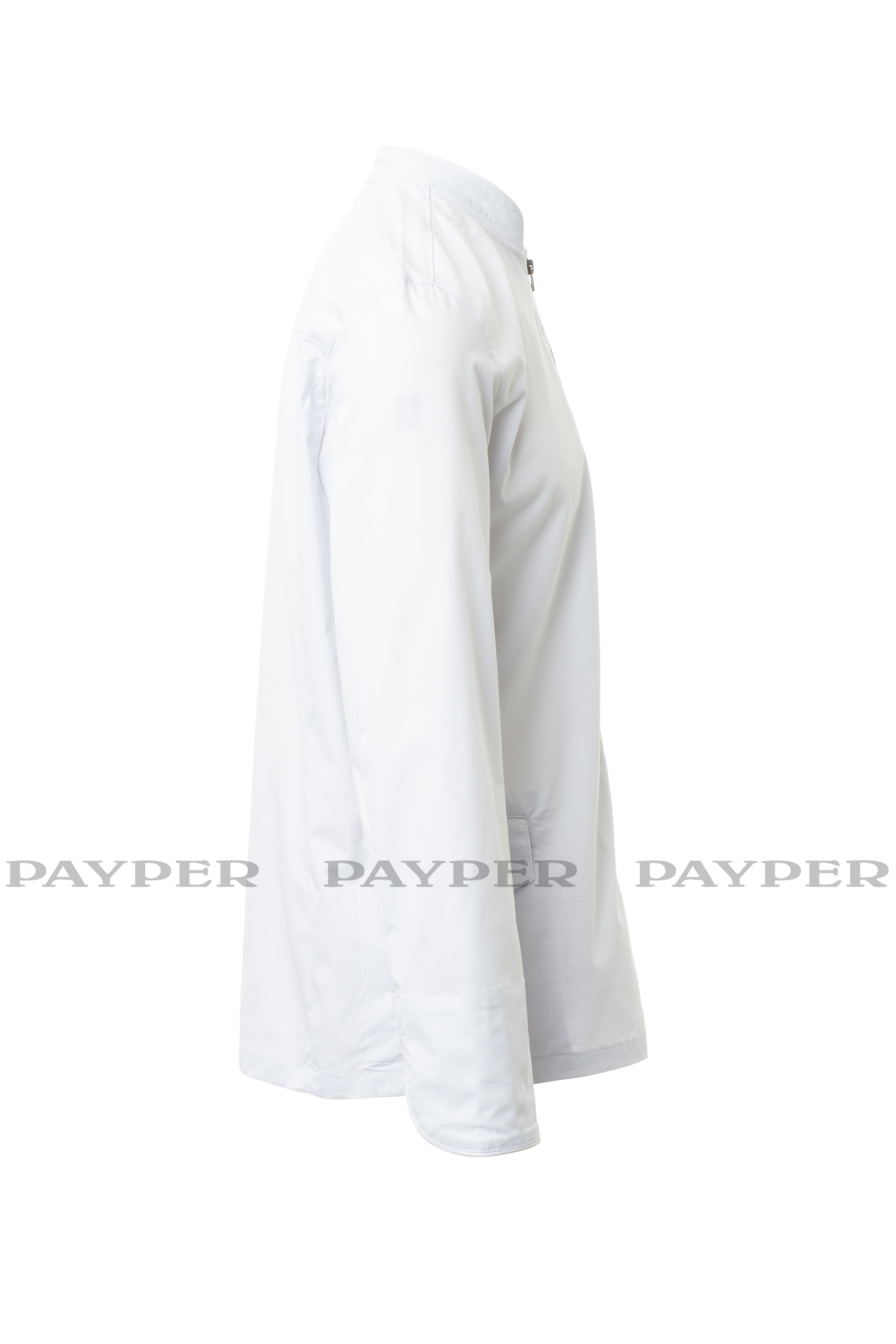 Chaqueta de cocina para hombre con cuello mao, confeccionada en ripstop de algodón y Lycra® T400®, con excelentes propiedades elásticas y transpirables. Cierre central con cremallera. Manga larga con puño vuelto, refuerzo de tejido de malla bajo la sisa para facilitar la transpiración. Emblemático parche contorneado en el hombro izquierdo, con bordado de hélice tono sobre tono, con pequeño bolsillo para bolígrafos. Bolsillo pequeño a la altura del pecho y práctico bolsillo para el teléfono móvil en la cintura, cerrado con tapeta. Ribetes a juego en cuello, puños y bolsillos.