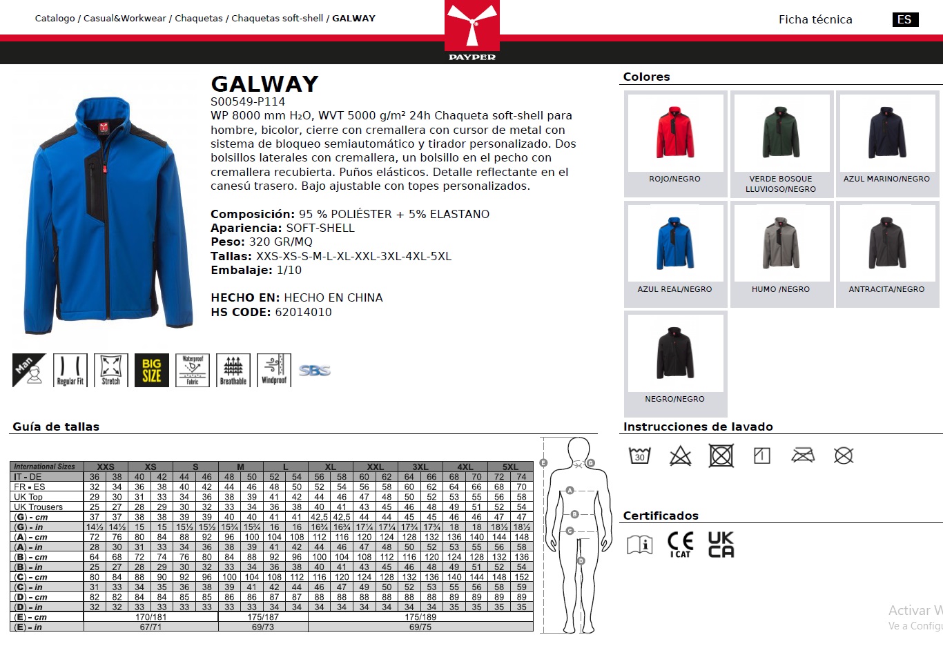 SOFTSHELL GALWAY · WATERPROOF · ELASTICO/STRETCH · CORTAVIENTOS · 3 CAPAS · CE I CAT