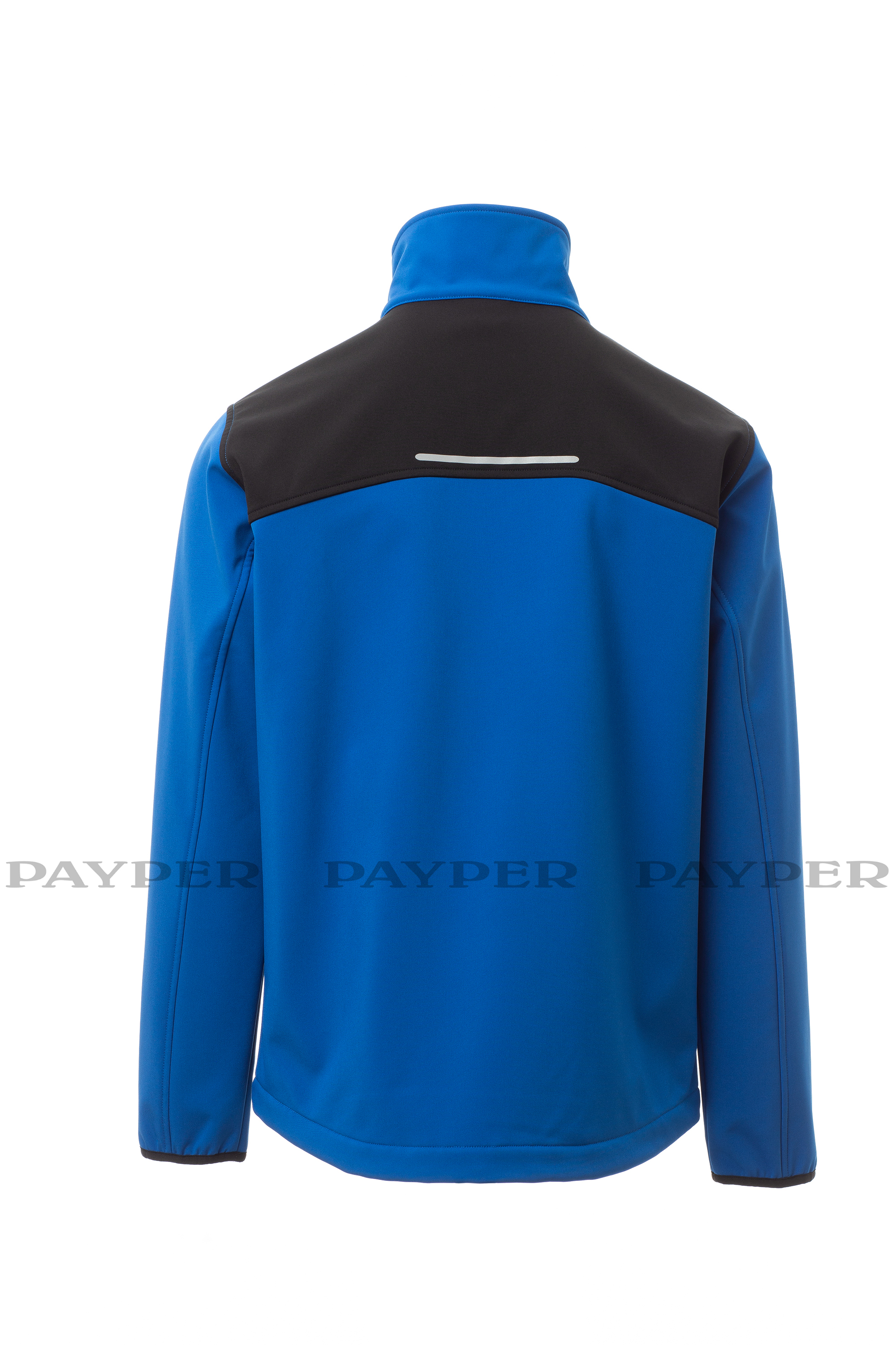Chaqueta soft-shell para hombre, bicolor, cierre con cremallera con cursor de metal con sistema de bloqueo semiautomático y tirador personalizado. Dos bolsillos laterales con cremallera, un bolsillo en el pecho con cremallera recubierta. Puños elásticos. Detalle reflectante en el canesú trasero. Bajo ajustable con topes personalizados.