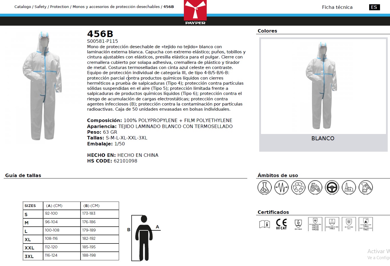 Mono de protección desechable de «tejido no tejido» blanco con laminación externa blanca. Capucha con extremo elástico; puños, tobillos y cintura ajustables con elásticos, presilla elástica para el pulgar. Cierre con cremallera cubierto por solapa adhesiva, cremallera de plástico y tirador de metal. Costuras termoselladas con cinta azul celeste en contraste. Equipo de protección individual de categoría III, de tipo 4-B/5-B/6-B: protección parcial contra productos químicos líquidos con cierres herméticos a prueba de salpicaduras (Tipo 4); protección contra partículas sólidas suspendidas en el aire (Tipo 5); protección limitada frente a salpicaduras de productos químicos líquidos (Tipo 6); protección contra el riesgo de acumulación de cargas electrostáticas; protección contra agentes infecciosos (B); protección contra la contaminación por partículas radioactivas