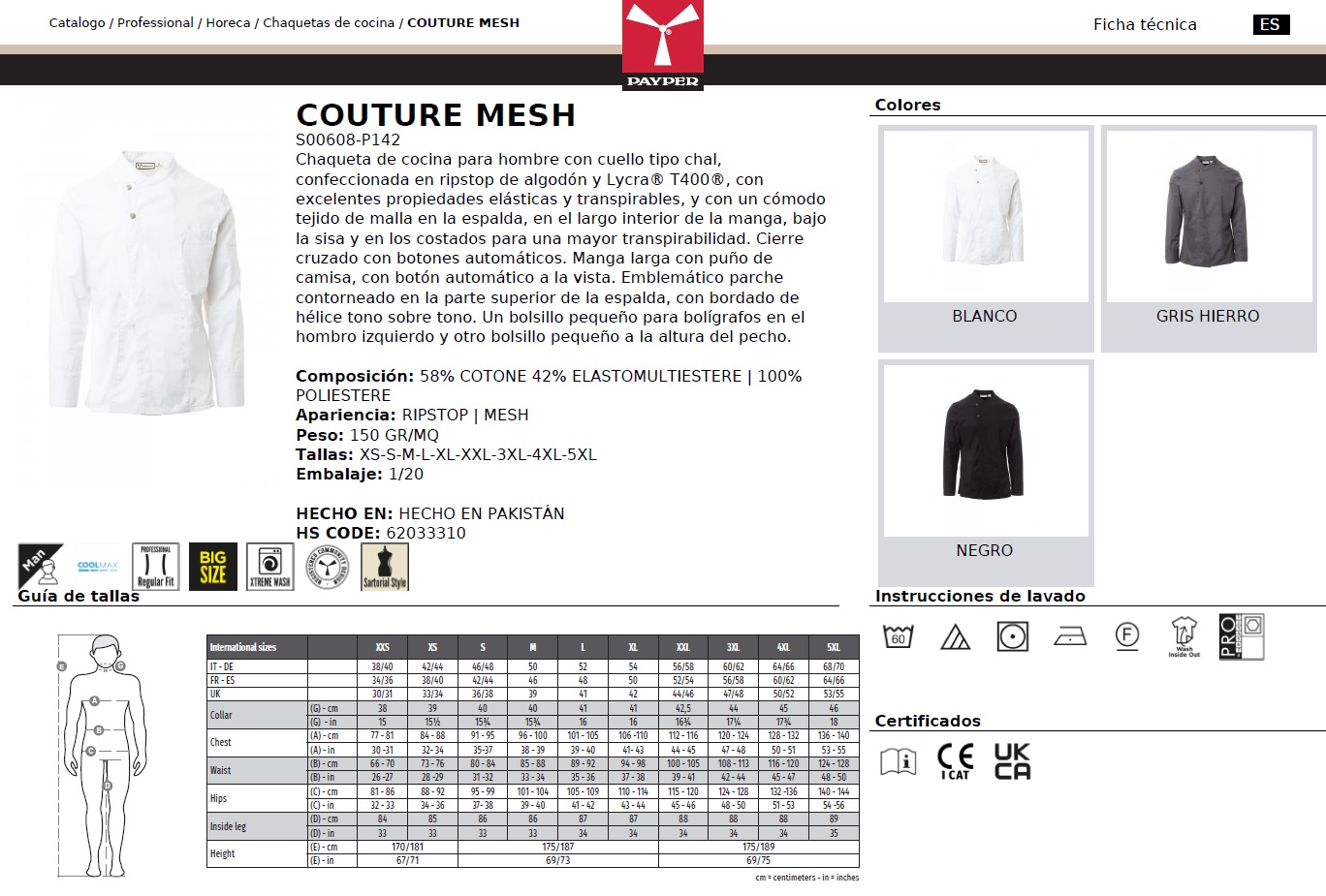 CHAQUETA COCINA COUTURE MESH · ELASTICO/STRETCH · CIERRE AUTOMATICOS · MALLA ESPALDA · COOLMAX · RIPSTOP · CE I CAT - Chaquetas Cocina - PayPer - Hombre