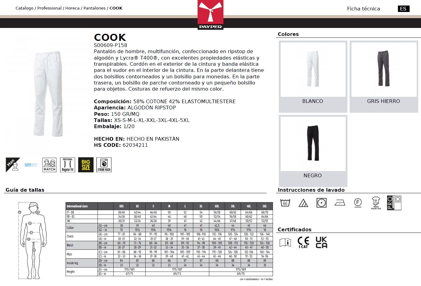 PANTALON COCINA COOK · ELASTICO/STRETCH · COOLMAX · RIPSTOP · CE I CAT