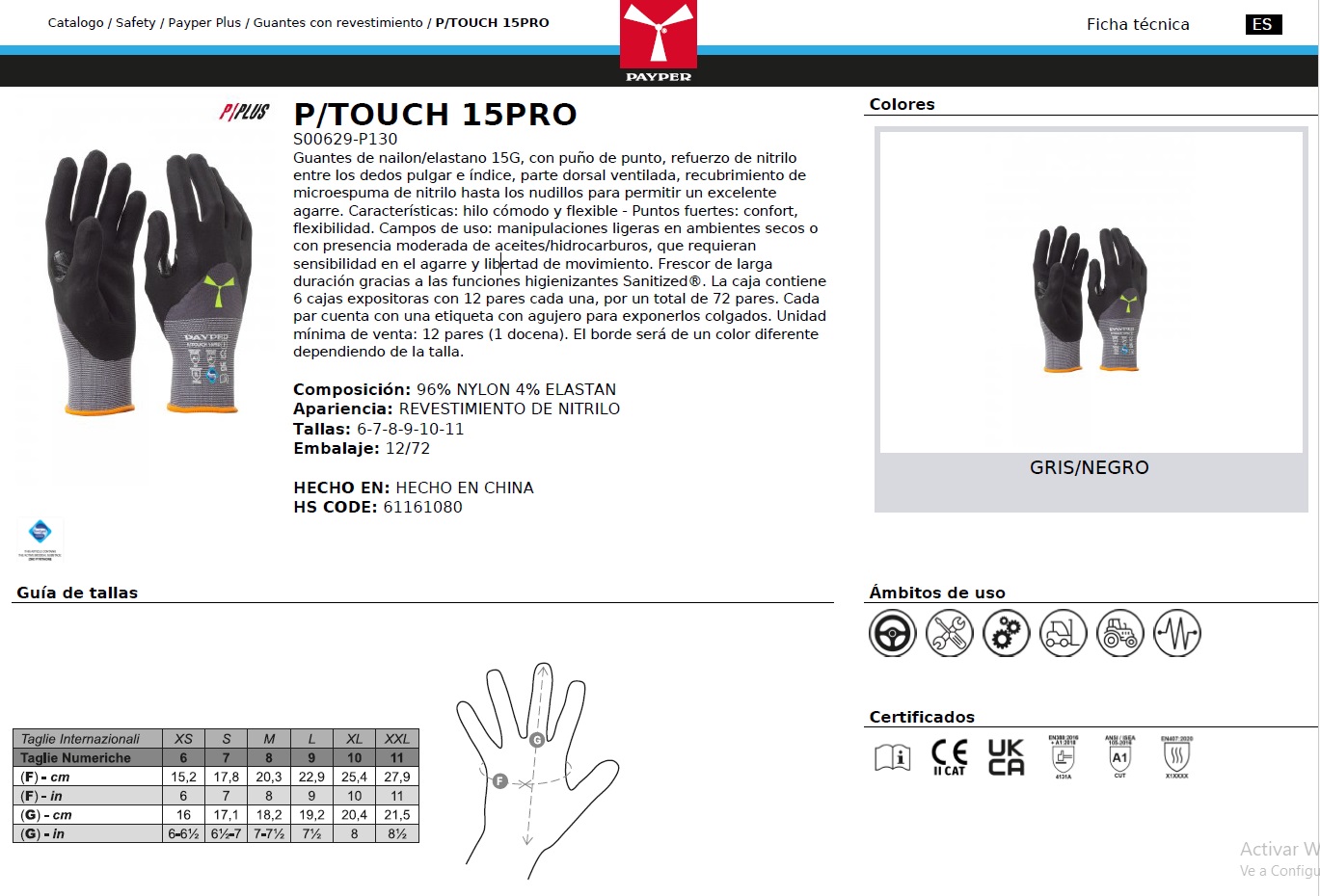 GUANTES P/TOUCH 15PRO · GALGA 15 · DORSAL VENTILADO | Pack 12 pares