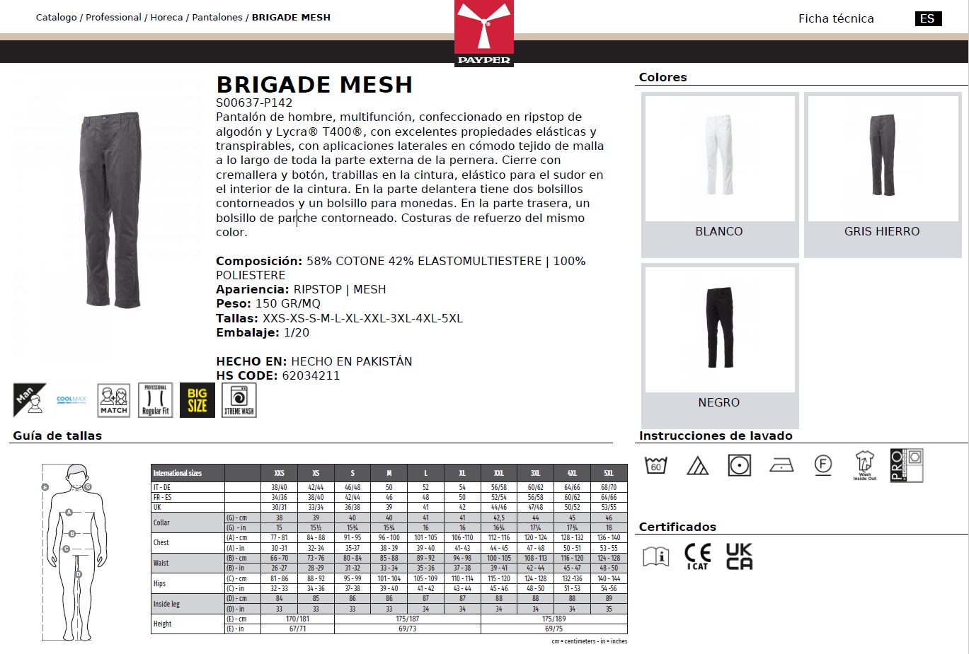 PANTALON COCINA BRIGADE MESH · ELASTICO/STRETCH · MALLA EXTERIOR PERNERA · RIPSTOP · COOLMAX · CE I CAT - Pantalones - PayPer - Hombre