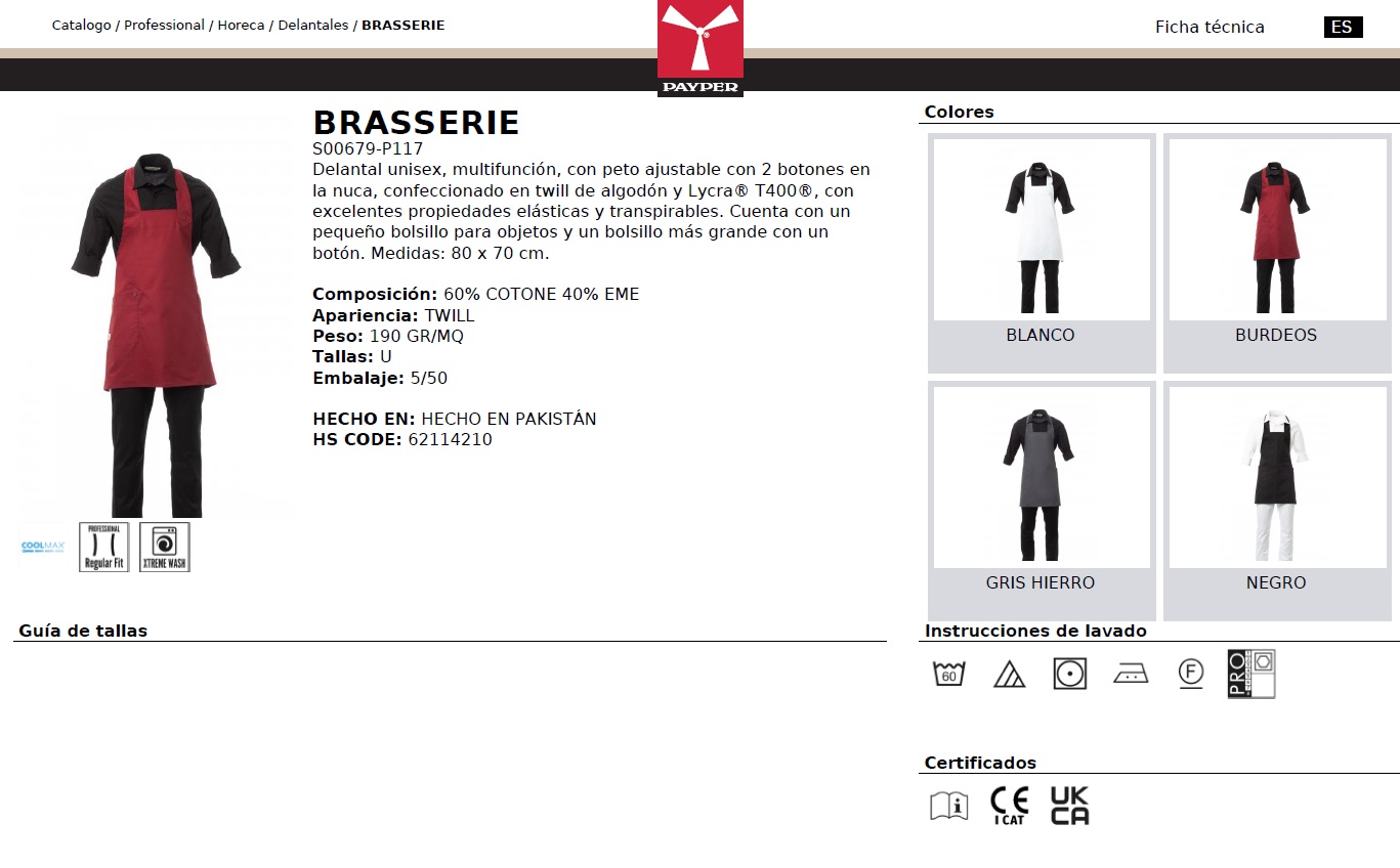 DELANTAL BRASSERIE · ELASTICO/STRETCH · BOLSILLO · COOLMAX · 80x70cm · CE I CAT | PACK 5 Unidades