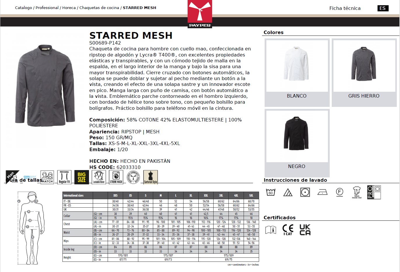 CHAQUETA COCINA STARRED MESH · ELASTICO/STRETCH · CIERRE AUTOMATICOS · MALLA ESPALDA-INTERIOR MANGA-BAJO SISA · COOLMAX · RIPSTOP · CE I CAT - Chaquetas Cocina - PayPer - Hombre