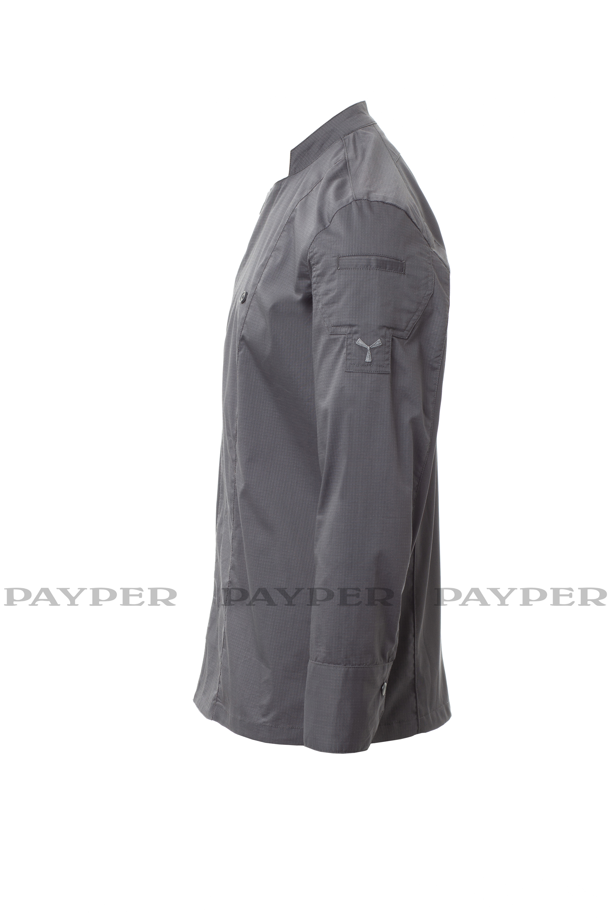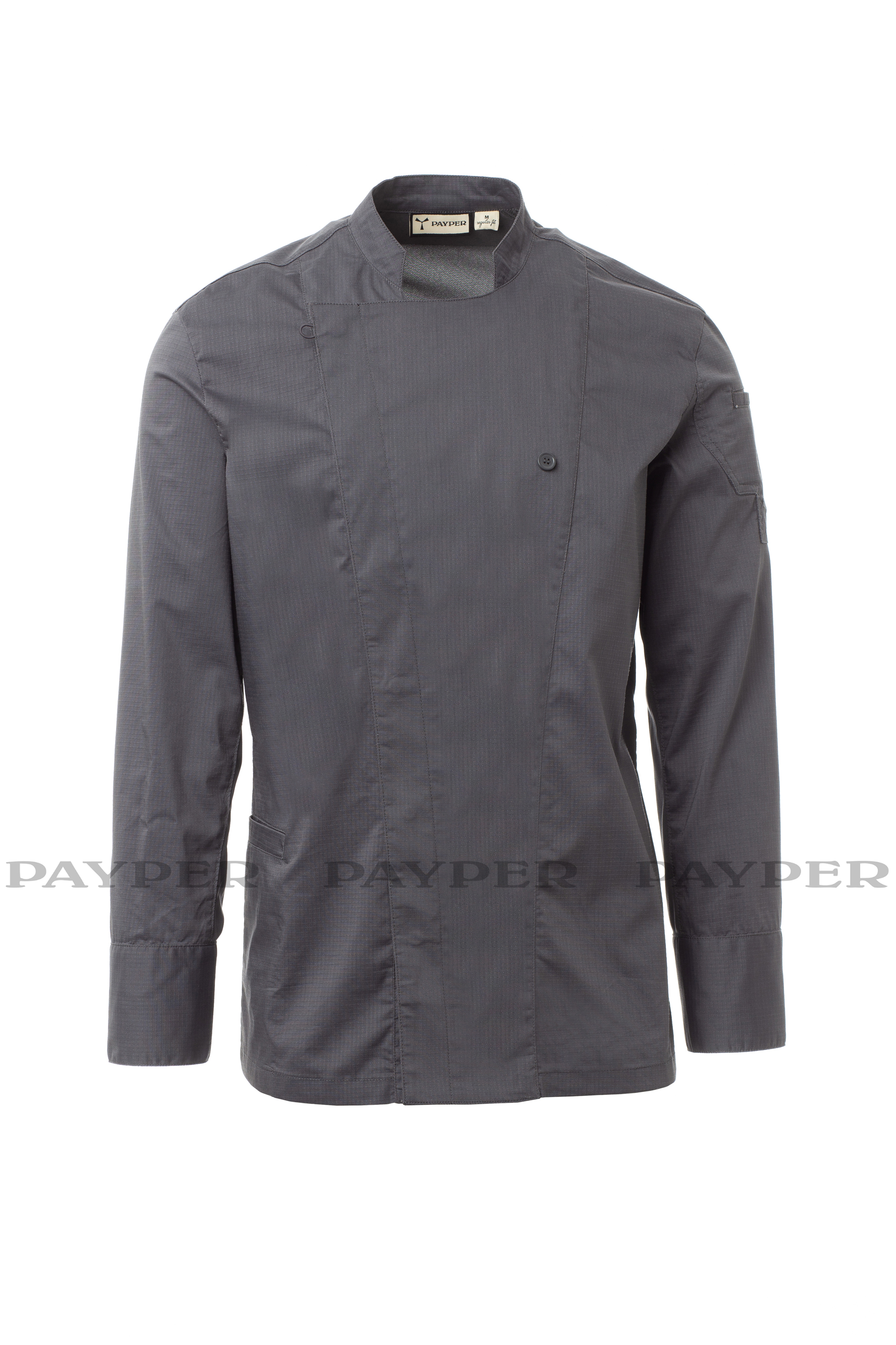 Chaqueta de cocina para hombre con cuello mao, confeccionada en ripstop de algodón y Lycra® T400®, con excelentes propiedades elásticas y transpirables, y con un cómodo tejido de malla en la espalda, en el largo interior de la manga y bajo la sisa para una mayor transpirabilidad. Cierre cruzado con botones automáticos, la solapa se puede doblar y sujetar al pecho mediante un botón a la vista, creando el efecto de una solapa sastre y un innovador escote en pico. Manga larga con puño de camisa, con botón automático a la vista. Emblemático parche contorneado en el hombro izquierdo, con bordado de hélice tono sobre tono, con pequeño bolsillo para bolígrafos. Práctico bolsillo para teléfono móvil en la cintura.