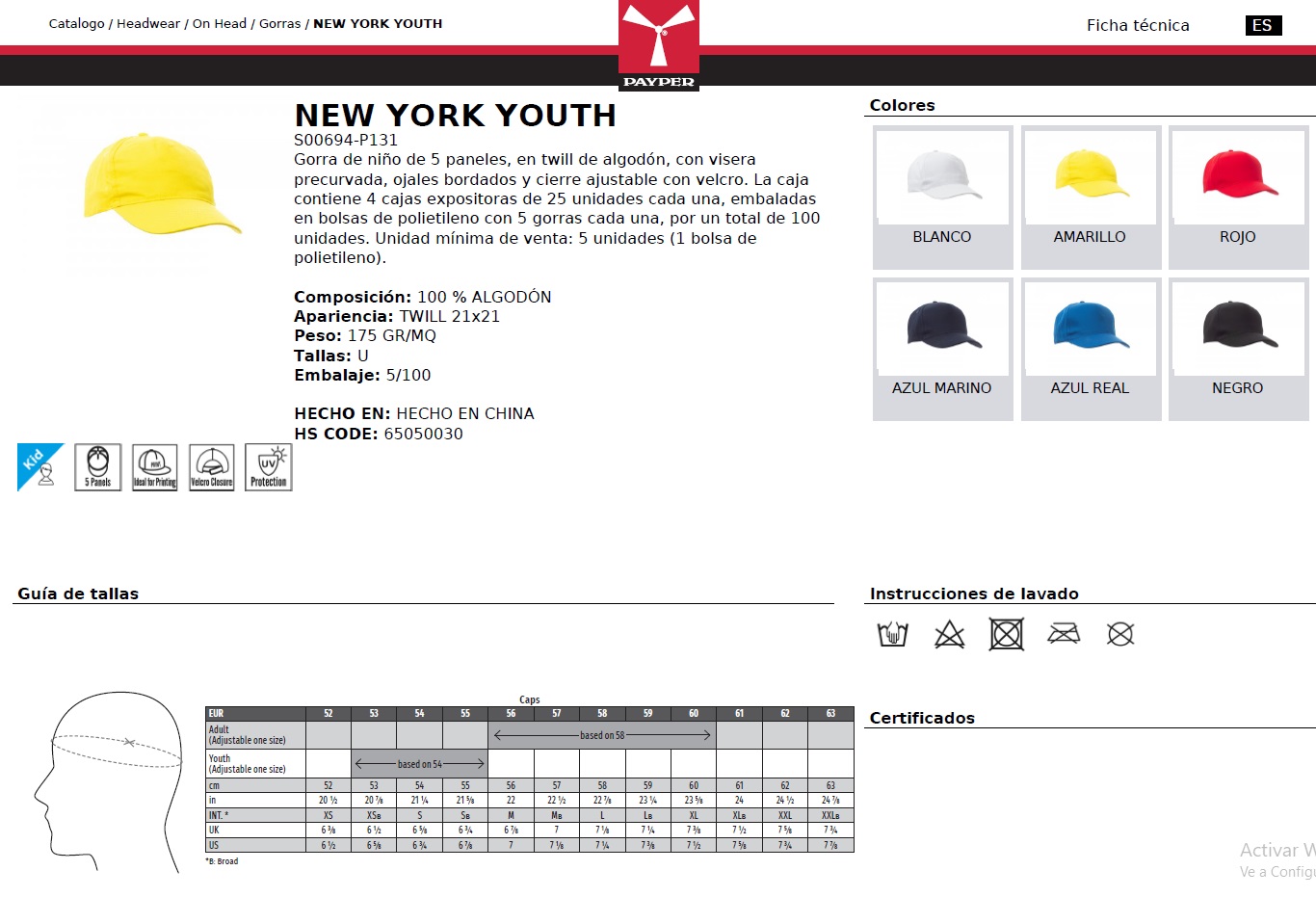 GORRA NEW YORK YOUTH · 5 PANELES · 100% ALGODON · PROTECCION SOLAR >50