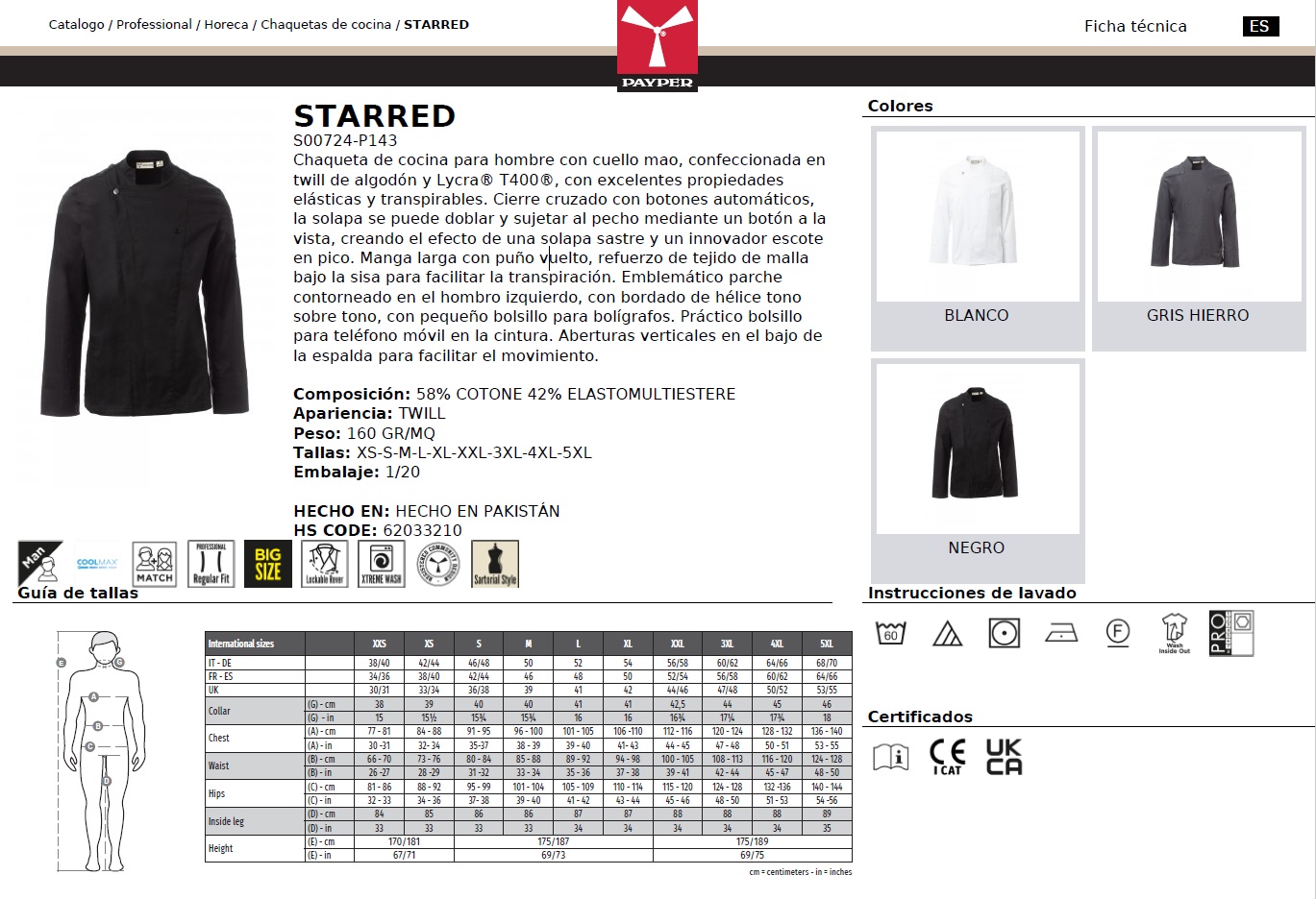 CHAQUETA COCINA STARRED · ESLASTICO/STRETCH · CIERRE AUTOMATICOS · MALLA BAJO SISA · COOLMAX · CE I CAT - Chaquetas Cocina - PayPer - Hombre