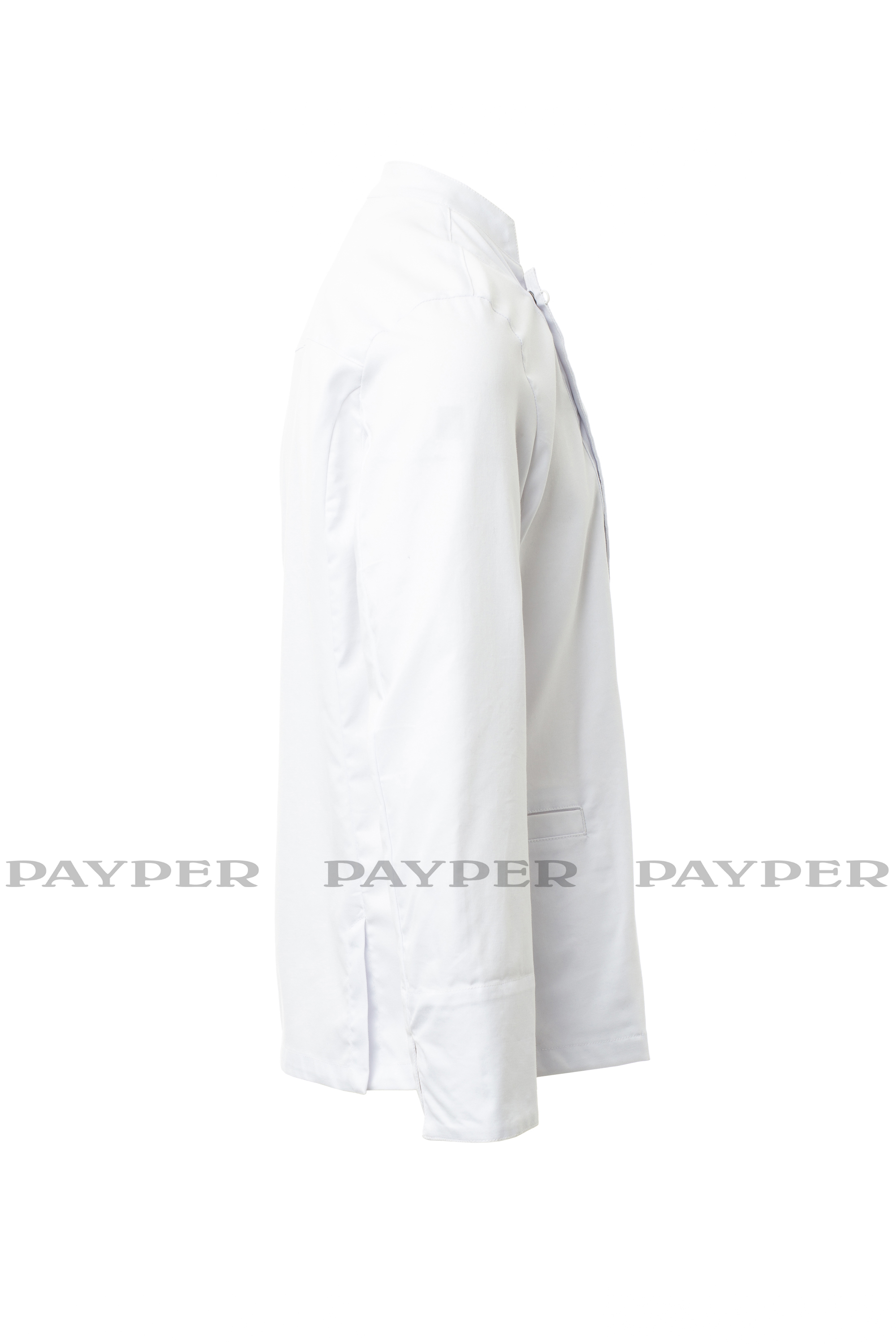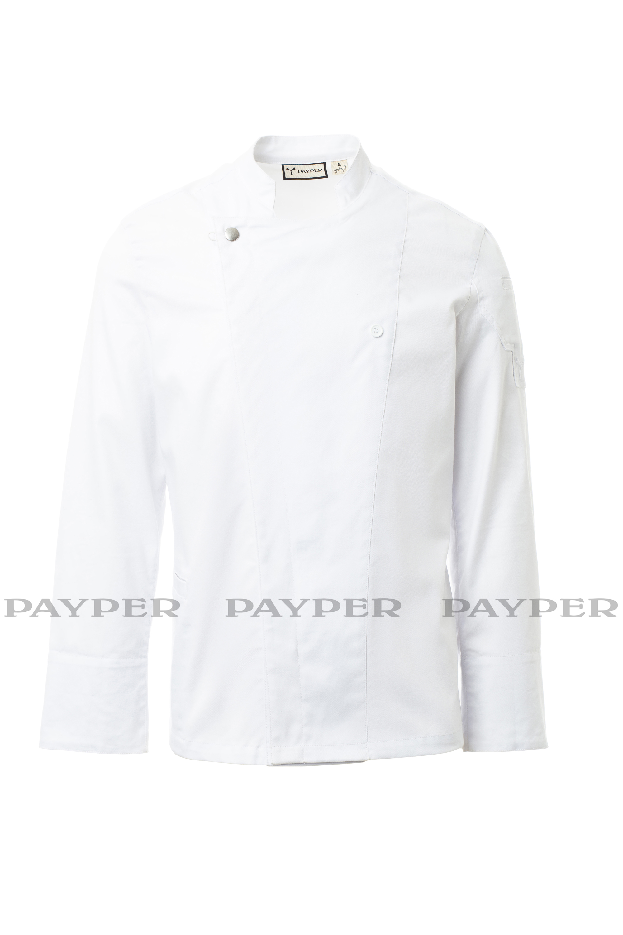 Chaqueta de cocina para hombre con cuello mao, confeccionada en twill de algodón y Lycra® T400®, con excelentes propiedades elásticas y transpirables. Cierre cruzado con botones automáticos, la solapa se puede doblar y sujetar al pecho mediante un botón a la vista, creando el efecto de una solapa sastre y un innovador escote en pico. Manga larga con puño vuelto, refuerzo de tejido de malla bajo la sisa para facilitar la transpiración. Emblemático parche contorneado en el hombro izquierdo, con bordado de hélice tono sobre tono, con pequeño bolsillo para bolígrafos. Práctico bolsillo para teléfono móvil en la cintura. Aberturas verticales en el bajo de la espalda para facilitar el movimiento.