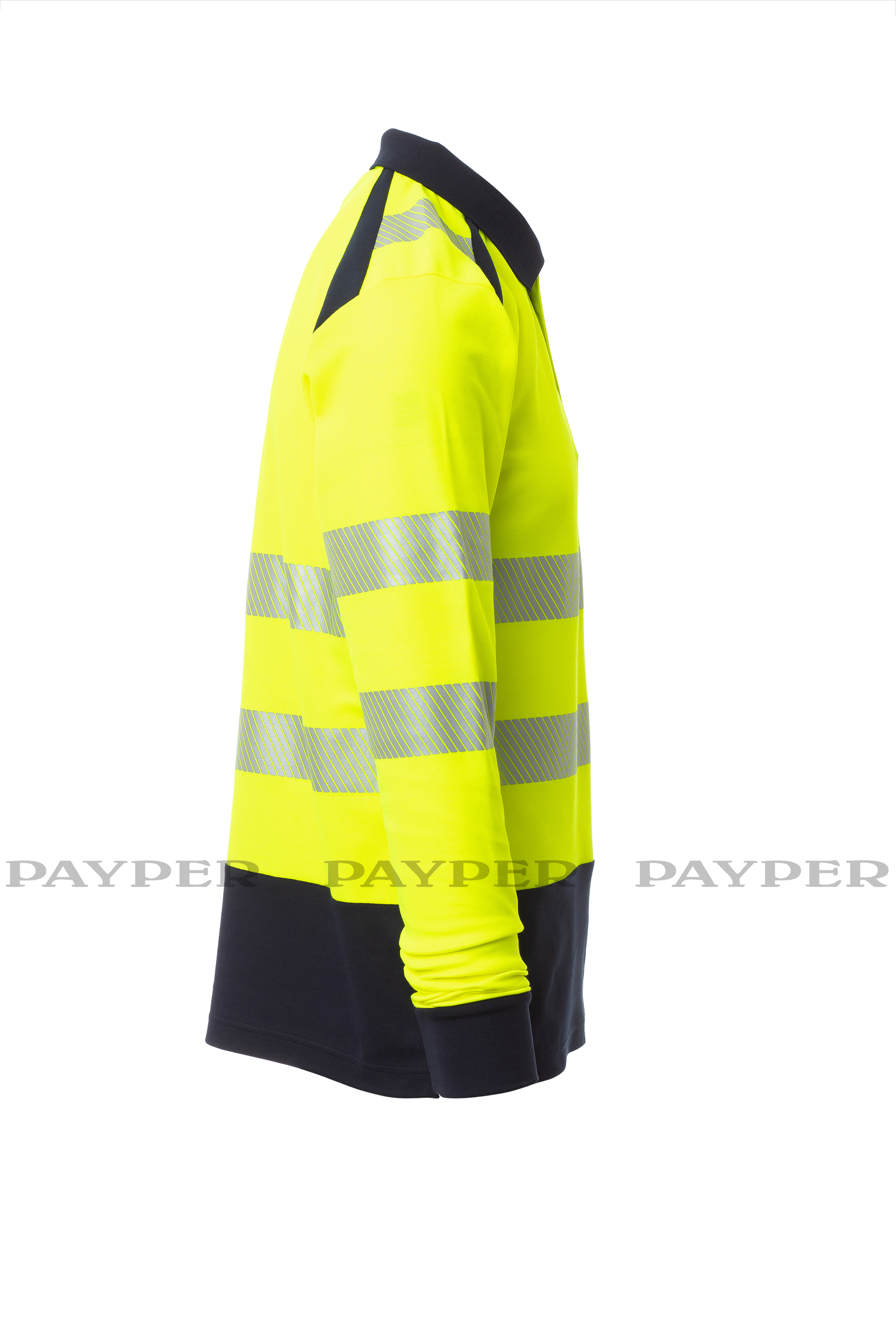 Polo bicolor de alta visibilidad, de manga larga. Cuello con 3 botones, con canalé y costuras cubiertas. Aberturas laterales. Bandas retrorreflectantes segmentadas y termoselladas para facilitar el movimiento. El tejido, confeccionado con algodón en el interior y poliéster en el exterior, garantiza una gran transpirabilidad y comodidad, así como una mayor durabilidad.