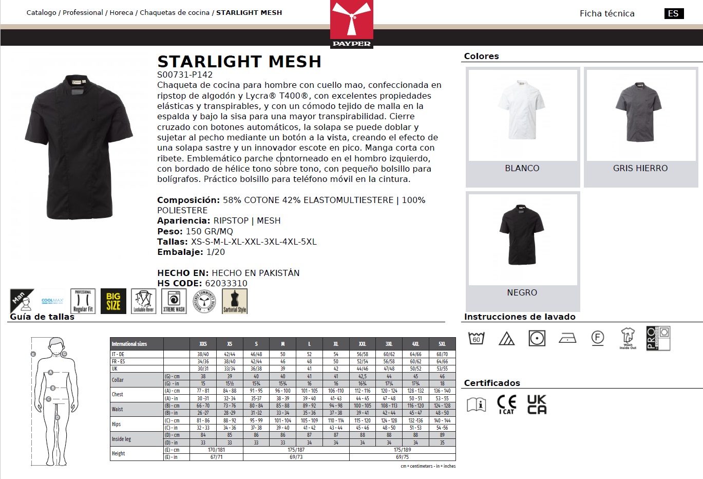 CHAQUETA COCINA STARLIGHT MESH · ELASTICO/STRETCH · CIERRE AUTOMATICOS · MALLA ESPALDA-BAJO SISA · COOLMAX · RIPSTOP · CE I CAT - Chaquetas Cocina - PayPer - Hombre