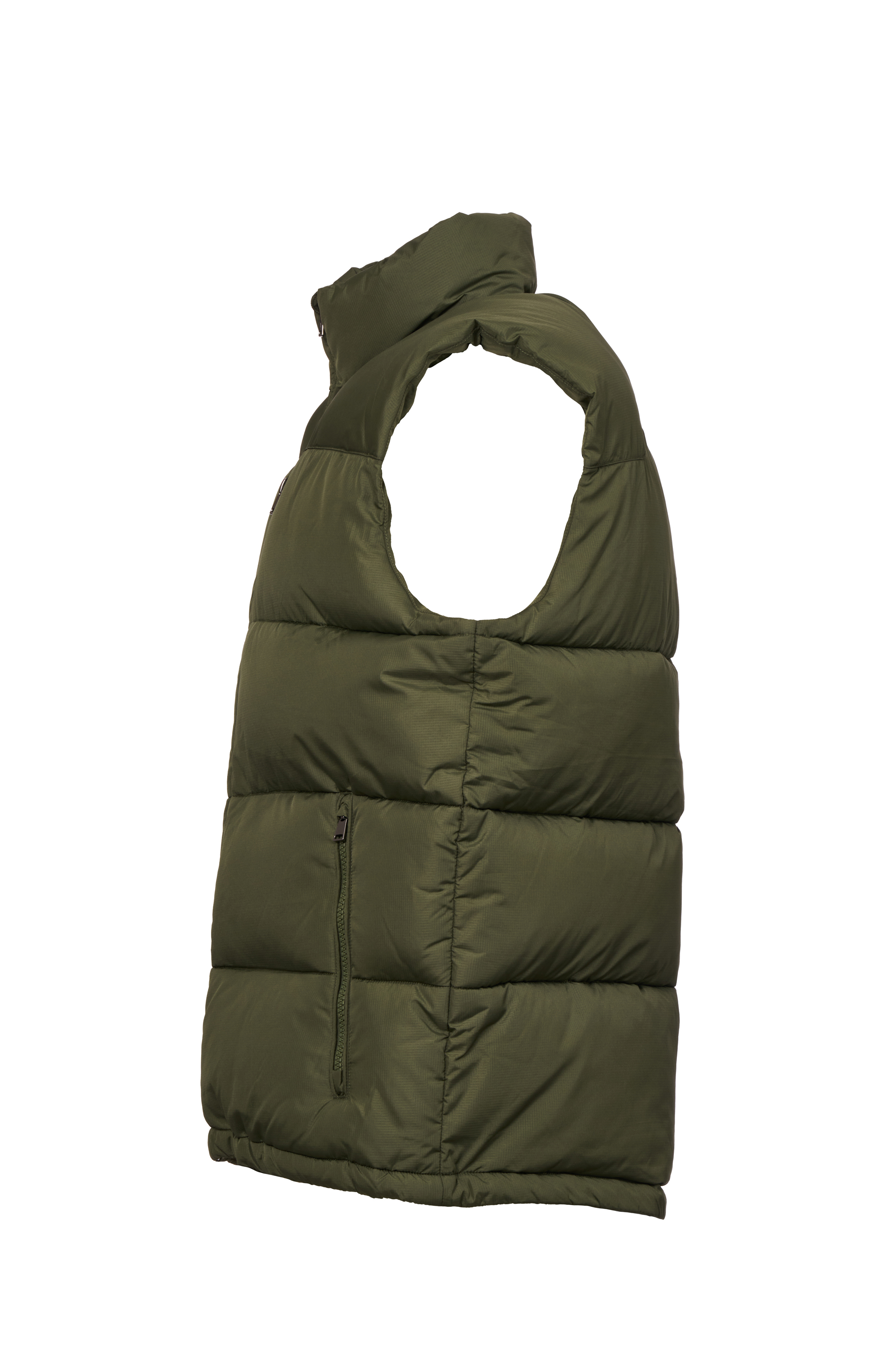 Chaleco acolchado de hombre, cierre con cremallera de plástico con cursor de metal personalizado con hélice, dos bolsillos laterales y un bolsillo en el pecho con cremallera. Ribetes en el mismo tono. Bajo ajustable con cordón. Bolsillo interior con cremallera. Interior acolchado en poliéster efecto pluma.