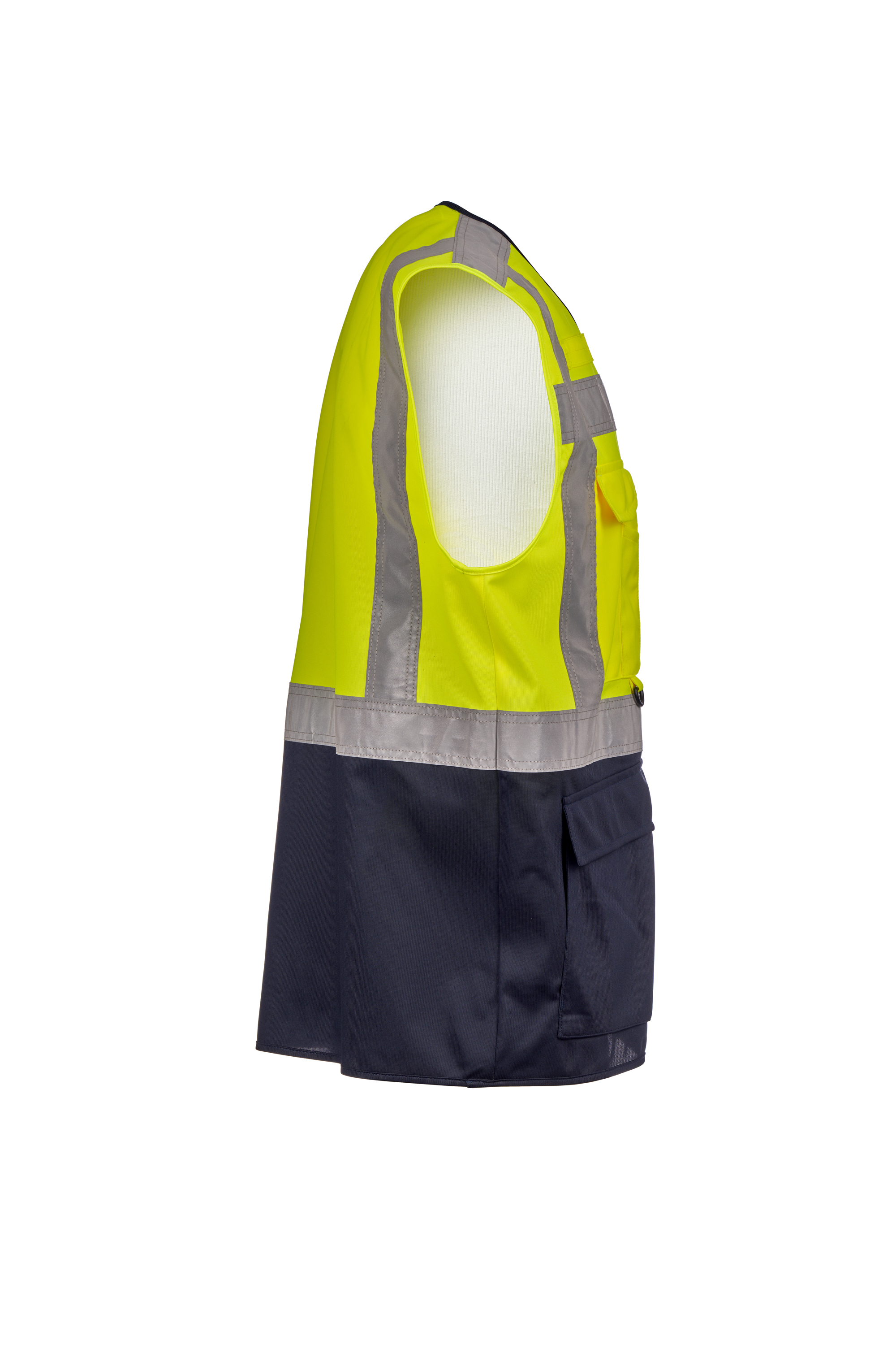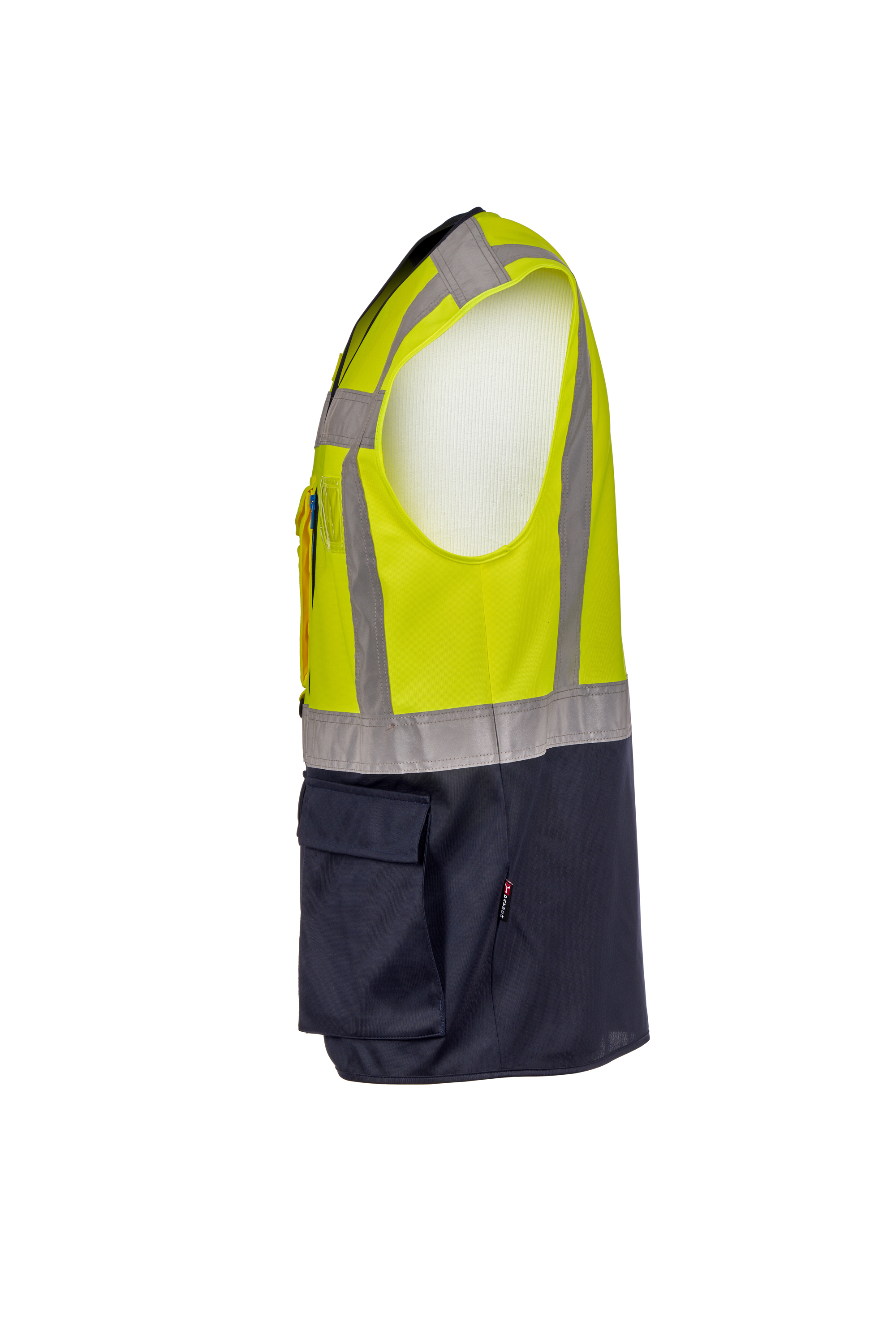 Chaleco de alta visibilidad, en tejido Dry-Tech, parte inferior de color de contraste, con bandas retrorreflectantes horizontales en hombros, pecho y cintura y dos bandas retrorreflectantes verticales. Cierre con cremallera, con cinta bicolor. Soporte fijo para tarjeta de identificación a la altura del pecho izquierdo con la prenda puesta. Trabilla multifunción, bolsillo para bolígrafos cerrado con velcro y anilla en el pecho derecho con la prenda puesta. Dos bolsillos externos con fuelle cerrados con velcro y apertura lateral en la parte inferior.