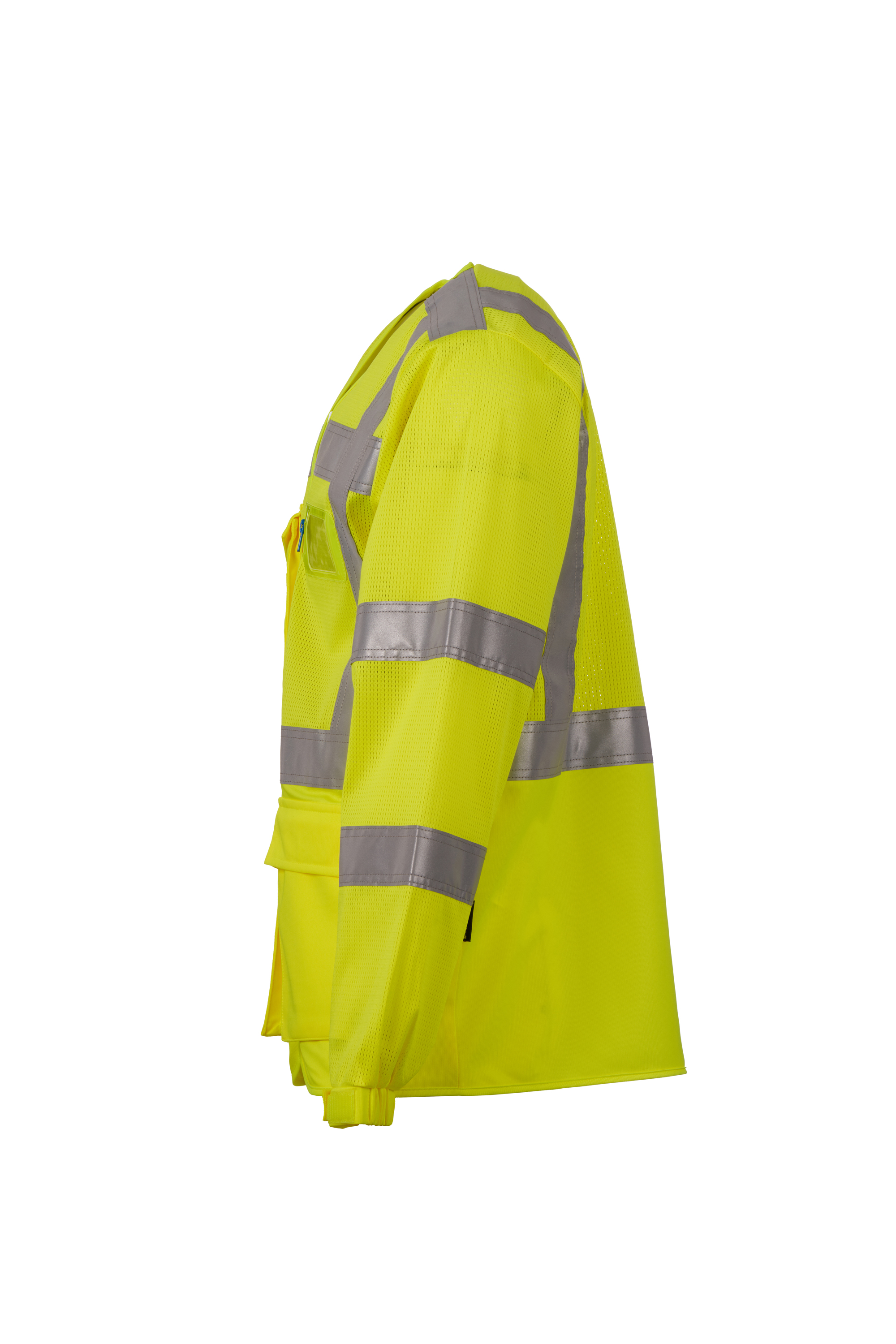 Chaleco sin forro de manga larga de alta visibilidad confeccionado en malla transpirable en la parte superior y en tejido Dry-Tech en la parte inferior, con bandas retrorreflectantes horizontales en hombros, pecho y cintura y dos bandas retrorreflectantes verticales. Cierre con cremallera SBS, con cinta bicolor. Soporte fijo para tarjeta de identificación a la altura del pecho izquierdo con la prenda puesta. Trabilla multifunción, un bolsillo para bolígrafos cerrado con velcro y anilla en el pecho derecho con la prenda puesta. Dos bolsillos exteriores con fuelle cerrados con velcro en la parte superior y apertura lateral.