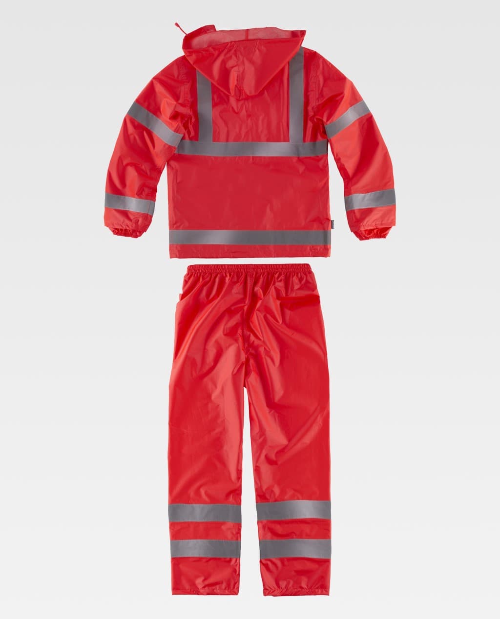 Traje de agua impermeable, de alta visibilidad y con cintas reflectantes. Parte superior: Impermeable con cierre de cremallera. Cuello alto con capucha interior ajustable con cordón. Dos bolsos laterales solapados. Un bolso de pecho de plastón con velcro en el interior. Una cinta reflectante en hombros y dos en pecho, espalda y mangas. Puño elástico en el interior de la manga. Bajo ajustable con cordón. Forro interior de rejilla. Parte inferior: Pantalón impermeable con cintura elástica. Dos cintas reflectantes en perneras. Aberturas laterales de acceso al interior. Bajo ajustable con corchetes.