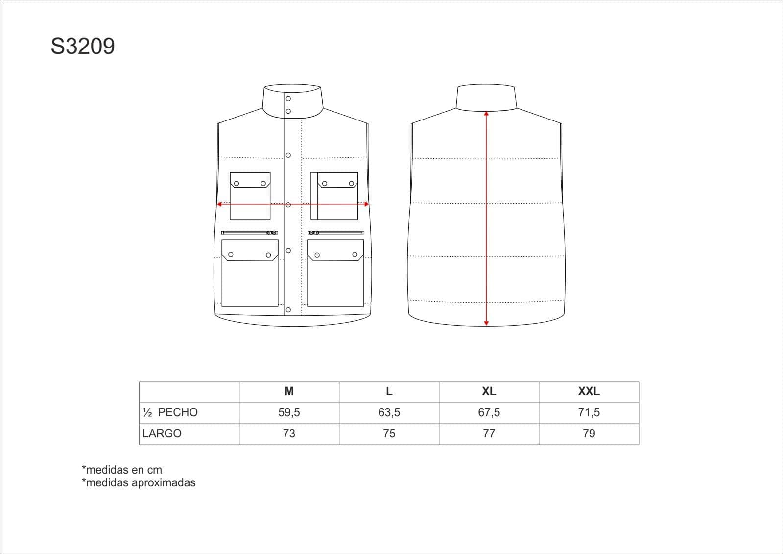 Chaleco acolchado de algodón con cuello alto. Cierre de cremallera de metal oculta por solapa de corchetes. Dos bolsos de pecho de plastón con cartera de corchetes y bolsillo para boli. Dos bolsos interiores con cierre de cremallera de metal en los costados. Dos bolsos laterales con fuelle y cartera de corchetes. Un bolso de plastón con cierre de velcro en el interior. Sisas ajustables.