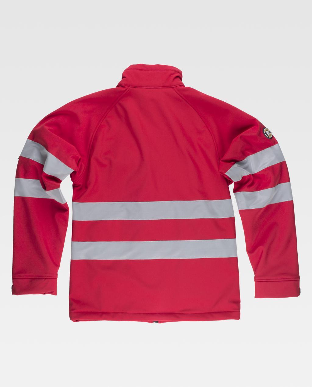 Chaqueta Workshell con cintas reflectantes. Cuello alto y cierre de cremallera. Solapa protectora interior vuelta en la parte superior cubriendo la cremallera. Un bolso de pecho y dos laterales interiores con cierre de cremallera. Dos cintas reflectantes en pecho, espalda y mangas. Manga ranglan y bocamanga ajustable con velcro. Cordón elástico con pieza ajustable en la cintura. Tejido corta vientos, repelente al agua y resistente al desgarro con membrana interior transpirable y aislante e interior de alta capacidad térmica.