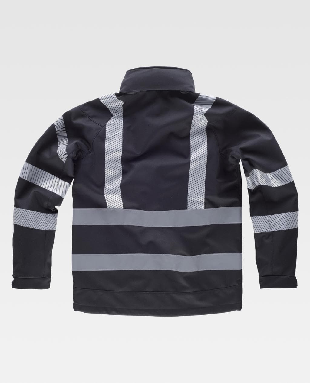 Workshell combinada con cintas reflectantes. Cuello alto y capucha enrollable con cordón para ajustar. Cierre de cremallera de nylon de cierre invertido. Solapa protectora interior vuelta en la parte superior cubriendo la cremallera. Dos bolsos laterales interiores con cremalleras de nylon. Un bolsillo en pecho y otro en la manga con cierre de cremallera. Cintas reflectantes segmentadas termoadhesivas en pecho, hombros, espalda y mangas. Dos cintas cosidas en los costados y en la espalda. Cinta decorativa personalizada en una manga. Bocamanga ajustable con velcro. Cordón elástico con pieza ajustable en el bajo. Tejido corta vientos, repelente al agua y resistente al desgarro con membrana interior transpirable y aislante e interior de alta capacidad térmica. Tejido interior super suave, con forro de rejilla en delantero.
