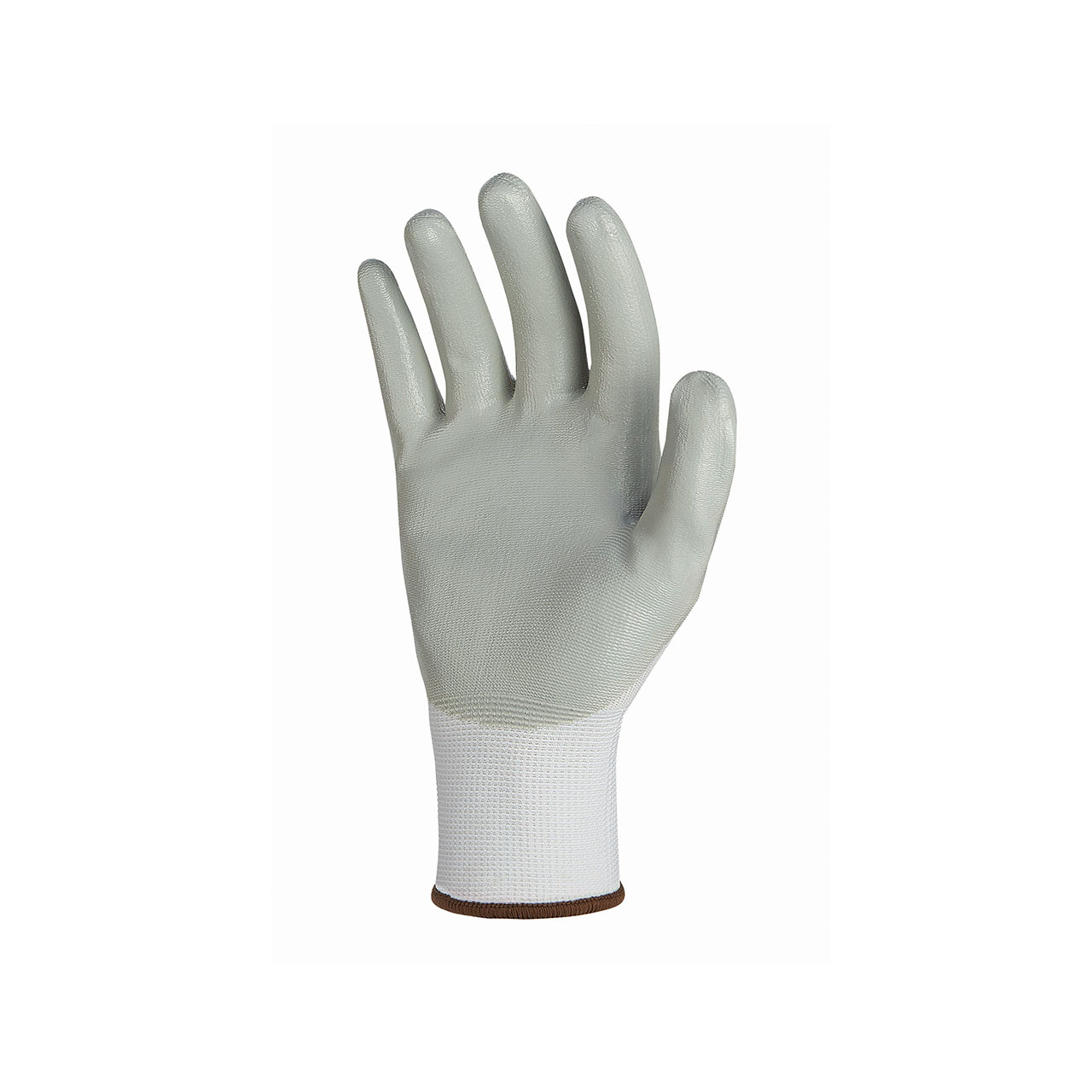 Guantes ligeros de trabajo con forro de nailon blanco finura 13 con revestimiento en micro-espuma de nitrilo gris claro.