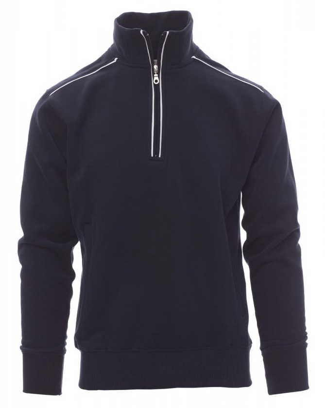 Sudadera con media cremallera de plástico con tirador metálico, ribete de contraste en hombros, borde de la cremallera y espalda. Dos bolsillos con cremallera, puños y dobladillo elásticos