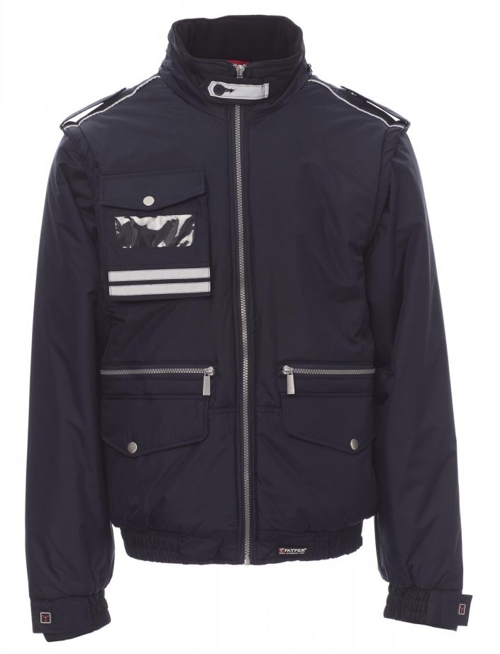 Chaqueta para hombre, de estilo informal y efecto estilizado, con mangas extraíbles, cremallera de plástico con cursor de metal, capucha plegable en el cuello, cintura elástica y puños ajustables, presillas en hombro y cuello, dos bolsillos LOCK SYSTEM, dos bolsillos con cremallera, un bolsillo con soporte para tarjeta de identificación reversible, banda reflectante en los hombros y dos bandas reflectantes en la zona del pecho y espalda. Interior: acolchado, con forro plateado de alta densidad, espalda de micro forro polar, forro polar en la parte interior del cuello, un bolsillo.